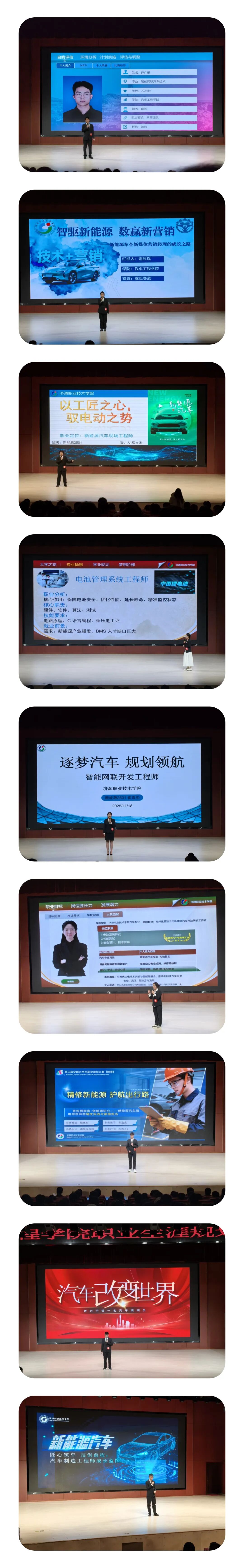 决赛现场,9名选手围绕自我认知、职业分析、规划实施等核心内容,深度结合汽车专业特色,以清晰的逻辑架构、生动的表达风格展现个性化职业规划蓝图,充分彰显了汽院学子扎实的专业素养与昂扬的青春担当。