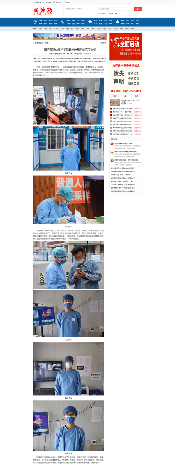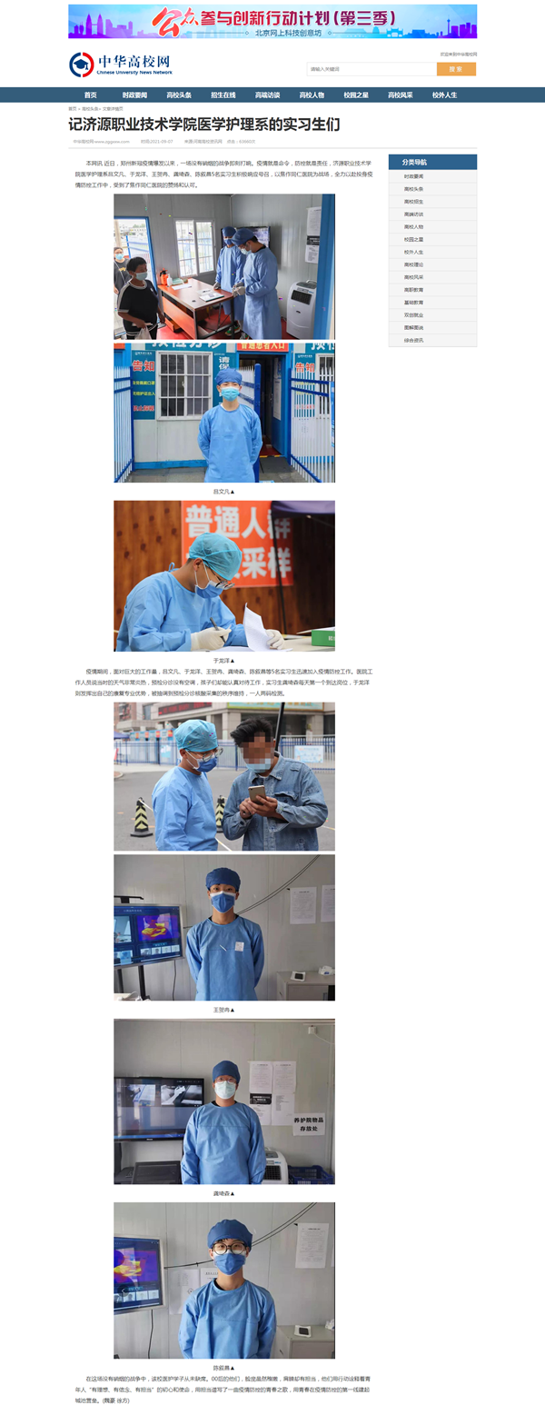 本网讯 近日,郑州新冠疫情爆发以来,一场没有硝烟的战争即刻打响。疫情就是命令,防控就是责任,济源职业技术学院医学护理系吕文凡、于龙洋、王贺冉、龚琦森、陈叙昌5名实习生积极响应号召,以焦作同仁医院为战场,全力以赴投身疫情防控工作中,受到了焦作同仁医院的赞扬和认可。