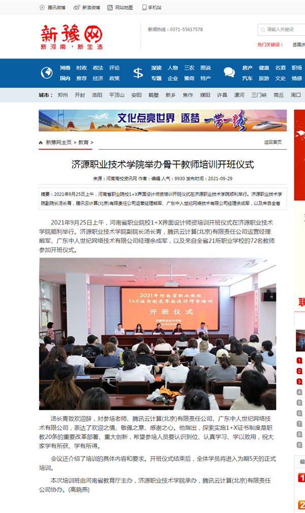 本网讯 2021年9月25日上午,河南省职业院校1+X界面设计师资培训开班仪式在济源职业技术学院顺利举行。济源职业技术学院副院长汤长青,腾讯云计算(北京)有限责任公司运营经理熊军、广东中人世纪网络技术有限公司经理余成军,以及来自全省21所职业学校的72名教师参加开班仪式。