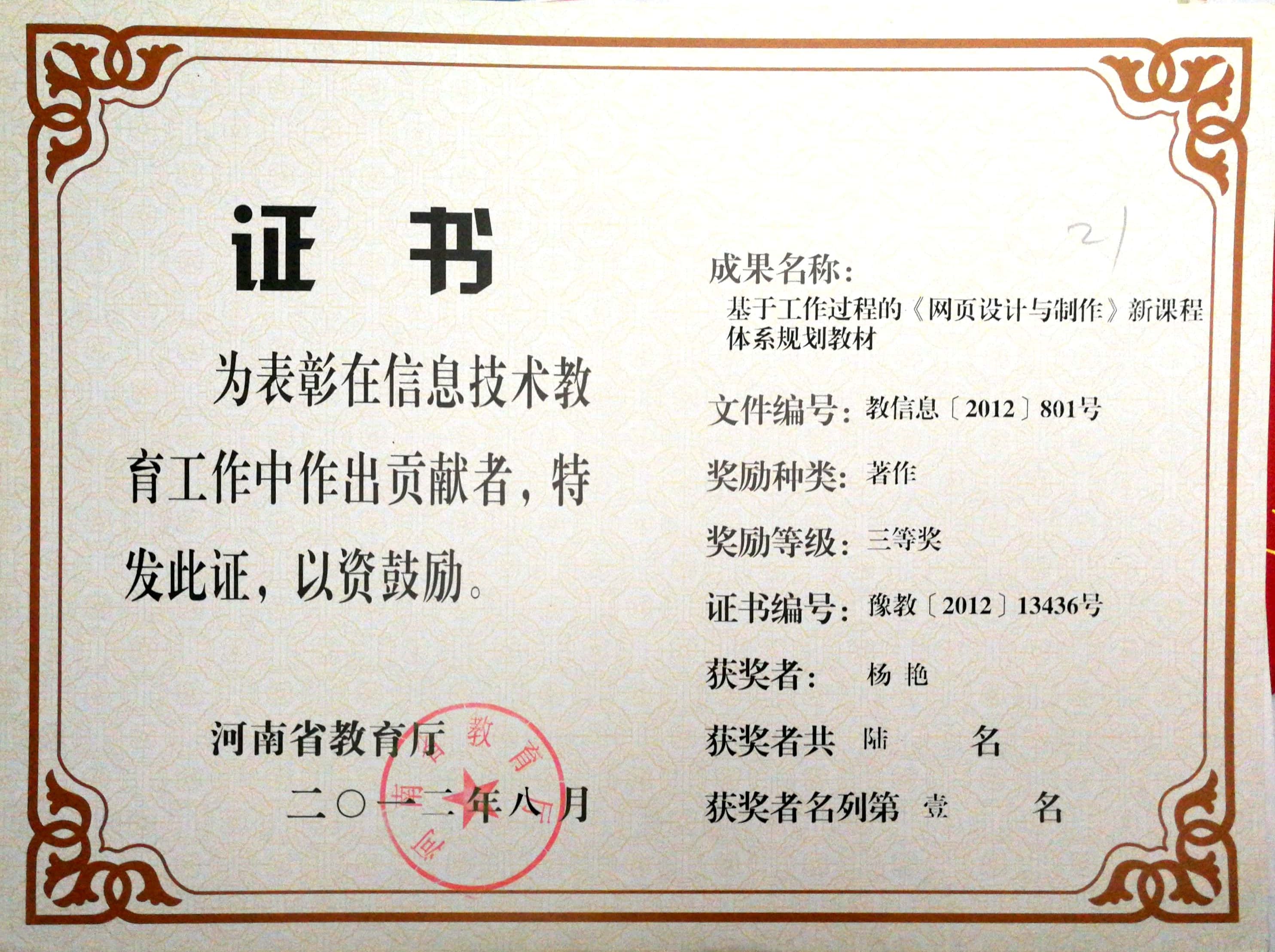 获信息技术优秀成果省级三等奖