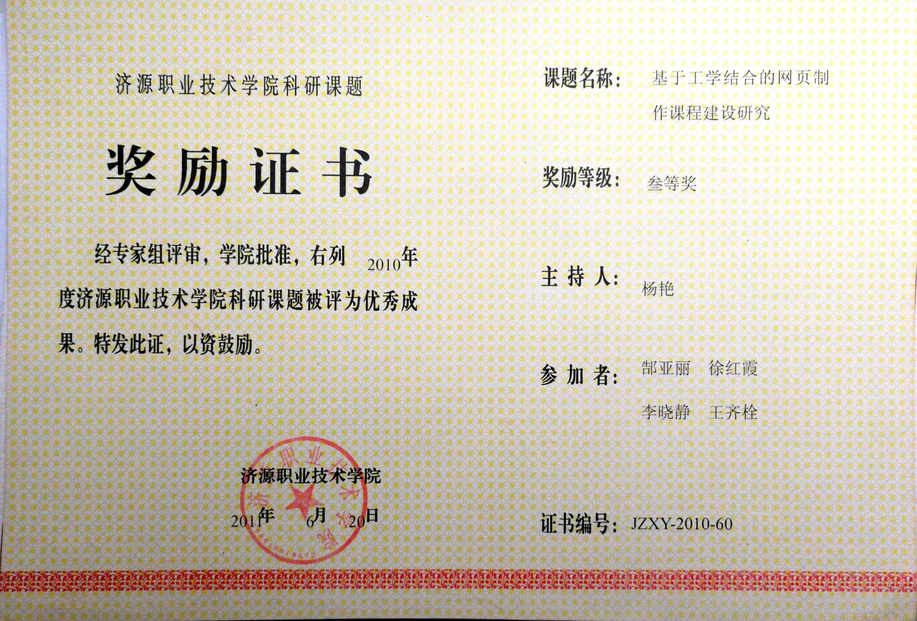基于工学结合的网页制作课程建设研究院级三等奖