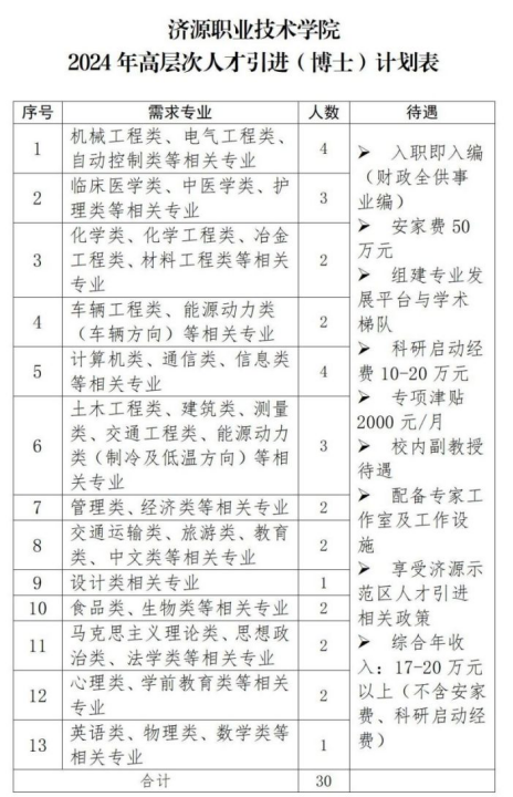 3.博士:数量及待遇详见《济源职业技术学院2024年高层次人才引进(博士)计划表》。