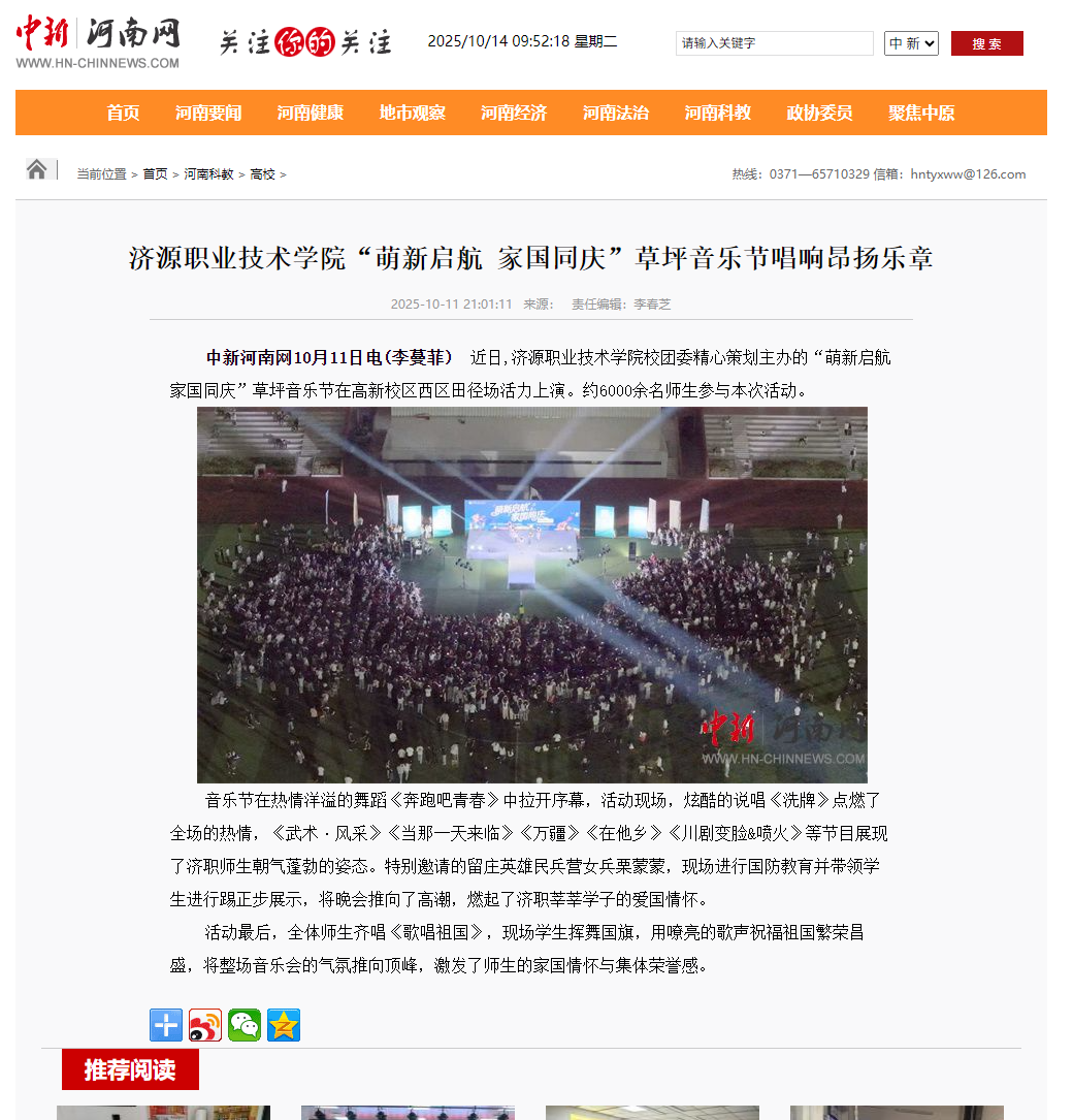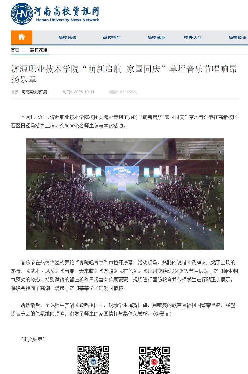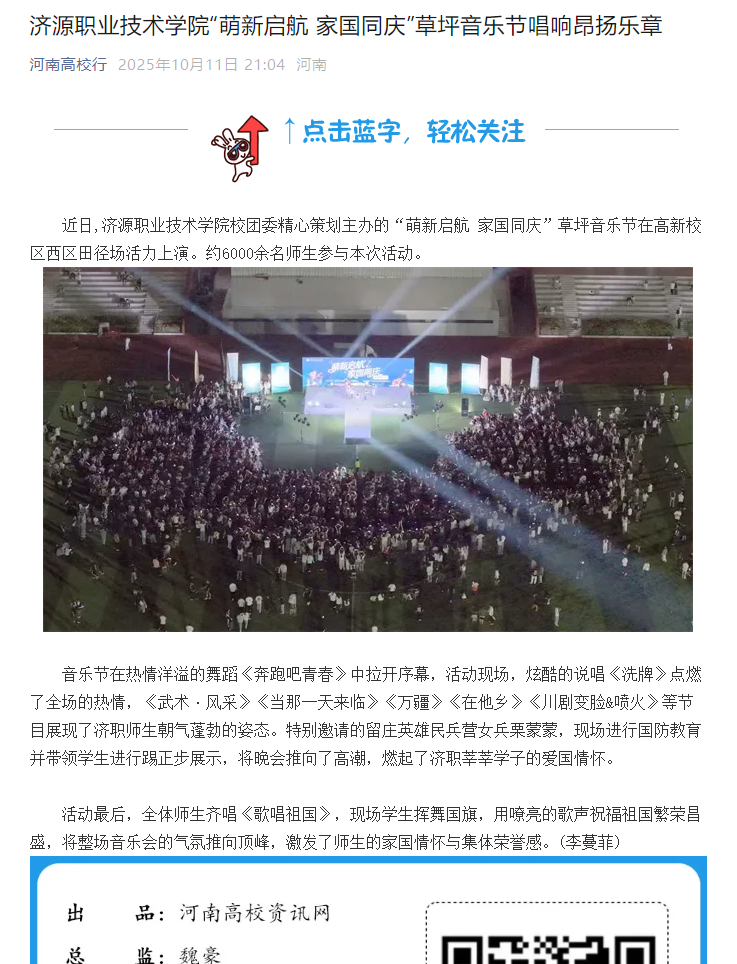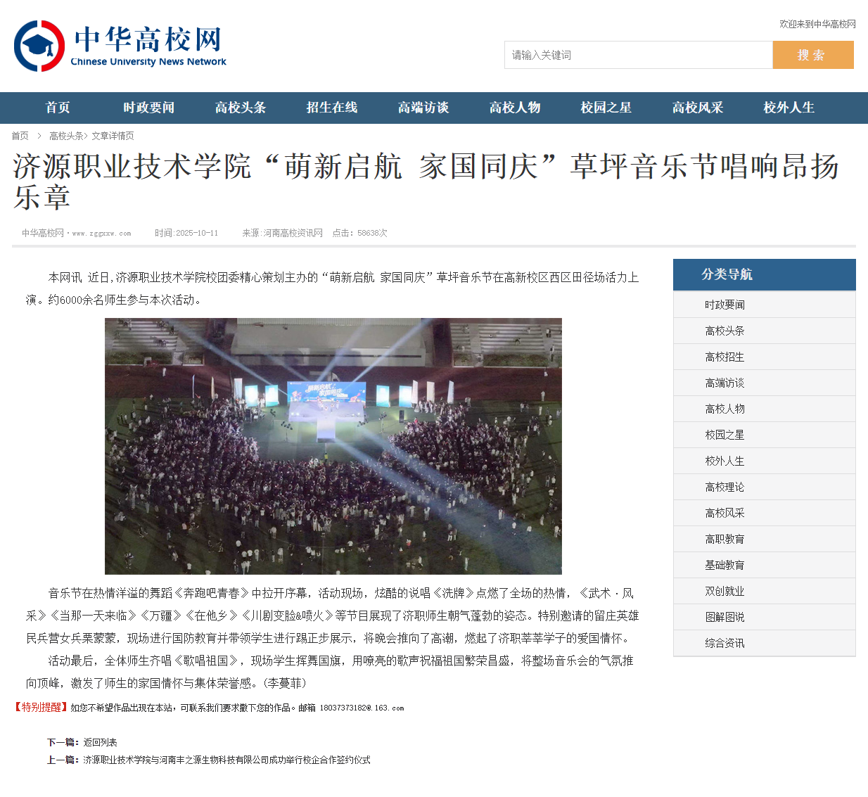 转自2025年10月11日 河南高校资讯网、中华高校网、中新网、河南高校行:济源职业技术学院“萌新启航 家国同庆”草坪音乐节唱响昂扬乐章