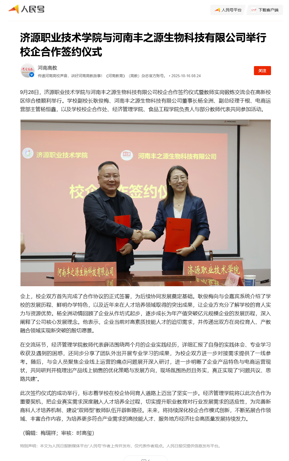 转自2025年10月16日 人民日报:济源职业技术学院与河南丰之源生物科技有限公司举行校企合作签约仪式