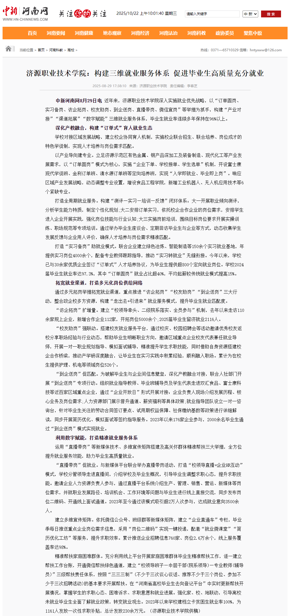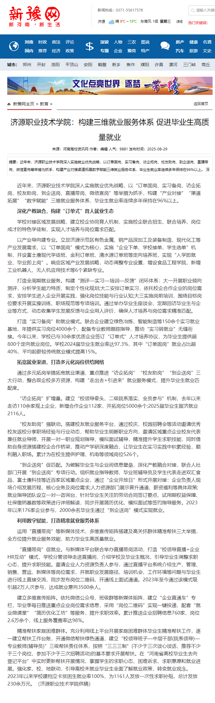 转自2025年9月29日 河南高校资讯网、河南高校行、中华高校网、中新网、新豫网:济源职业技术学院:构建三维就业服务体系 促进毕业生高质量充分就业