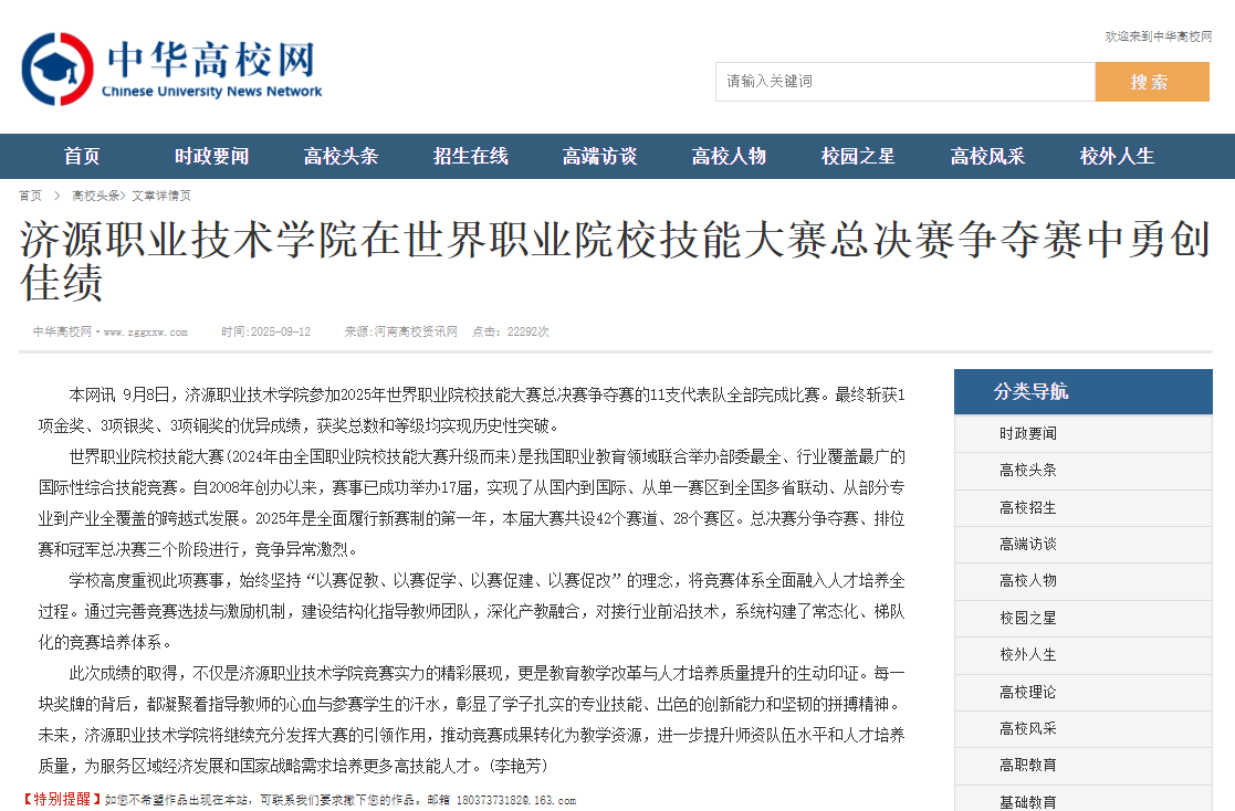 转自2025年9月12日 河南高校资讯网、河南高校行、中华高校网、中新网:济源职业技术学院在世界职业院校技能大赛总决赛争夺赛中勇创佳绩