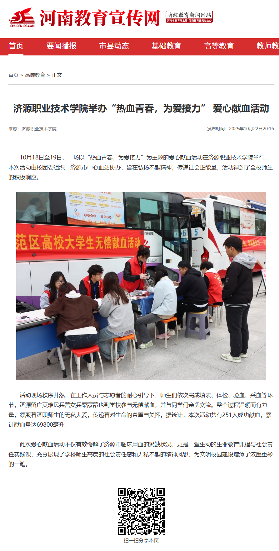 转自2025年10月22日 河南教育宣传网:济源职业技术学院举办“热血青春,为爱接力” 爱心献血活动