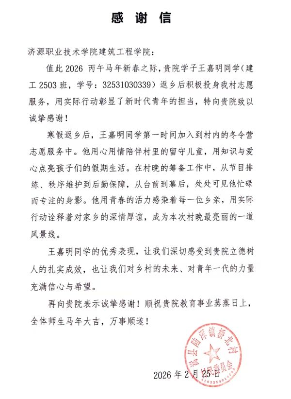近日,建筑工程学院收到一封来自嵩县陆浑镇桥北村村民委员会的感谢信,信中对建筑工程学院王嘉明同学在寒假期间返乡投身志愿服务的优秀表现给予高度评价,并向学院致以诚挚的感谢。