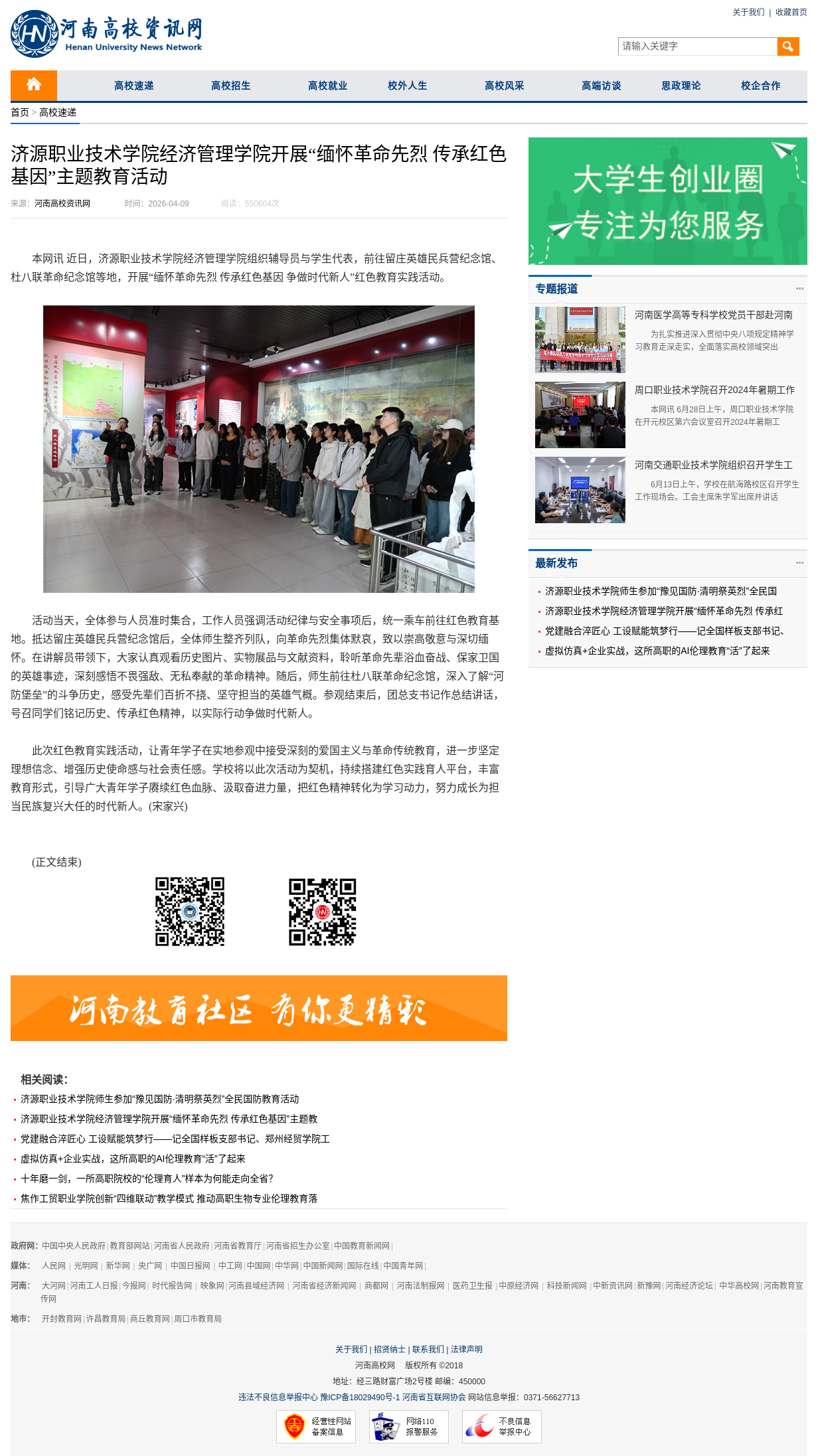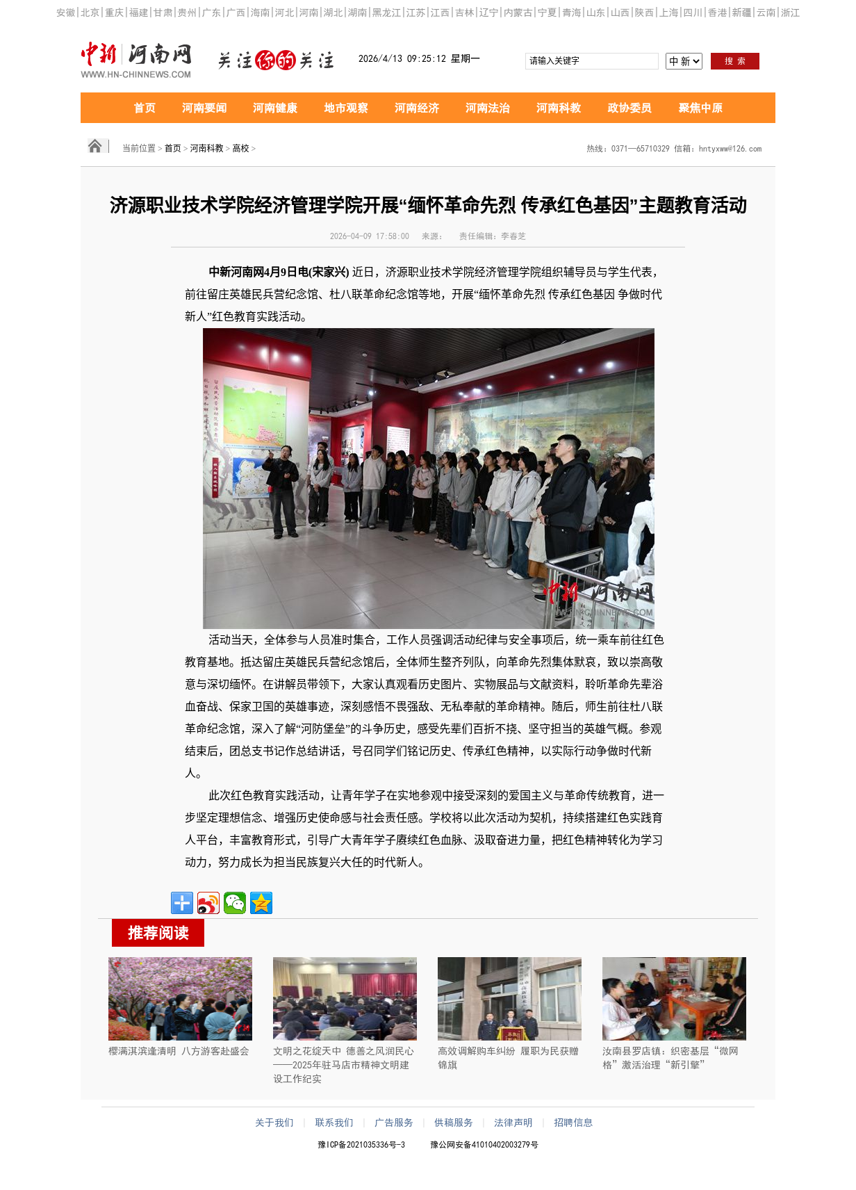 转自2026年4月9日 河南高校资讯网、中华高校网、中新网、河南高校行:济源职业技术学院经济管理学院开展“缅怀革命先烈 传承红色基因”主题教育活动