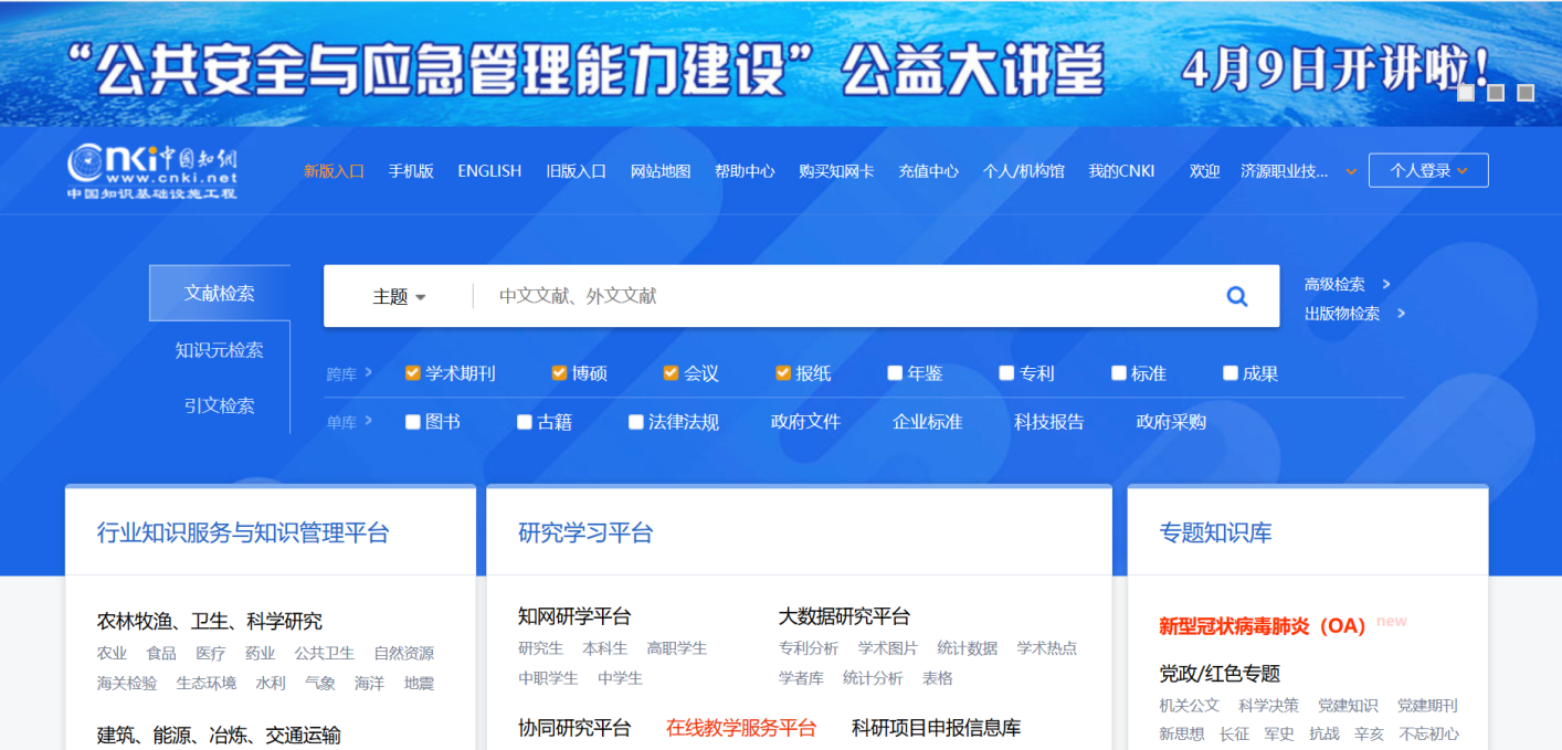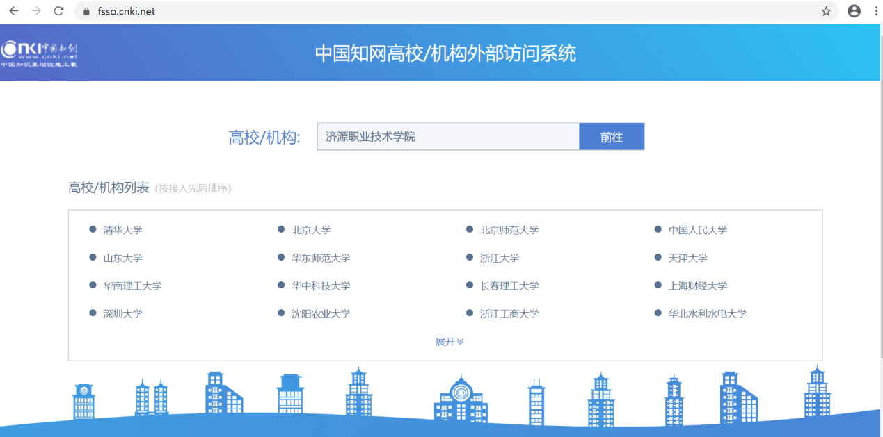 一、登录中国知网外部访问系统,网址:http://fsso.cnki.net,然后在搜索框输入“济源职业技术学院”,然后点击“前往”,如下图所示: