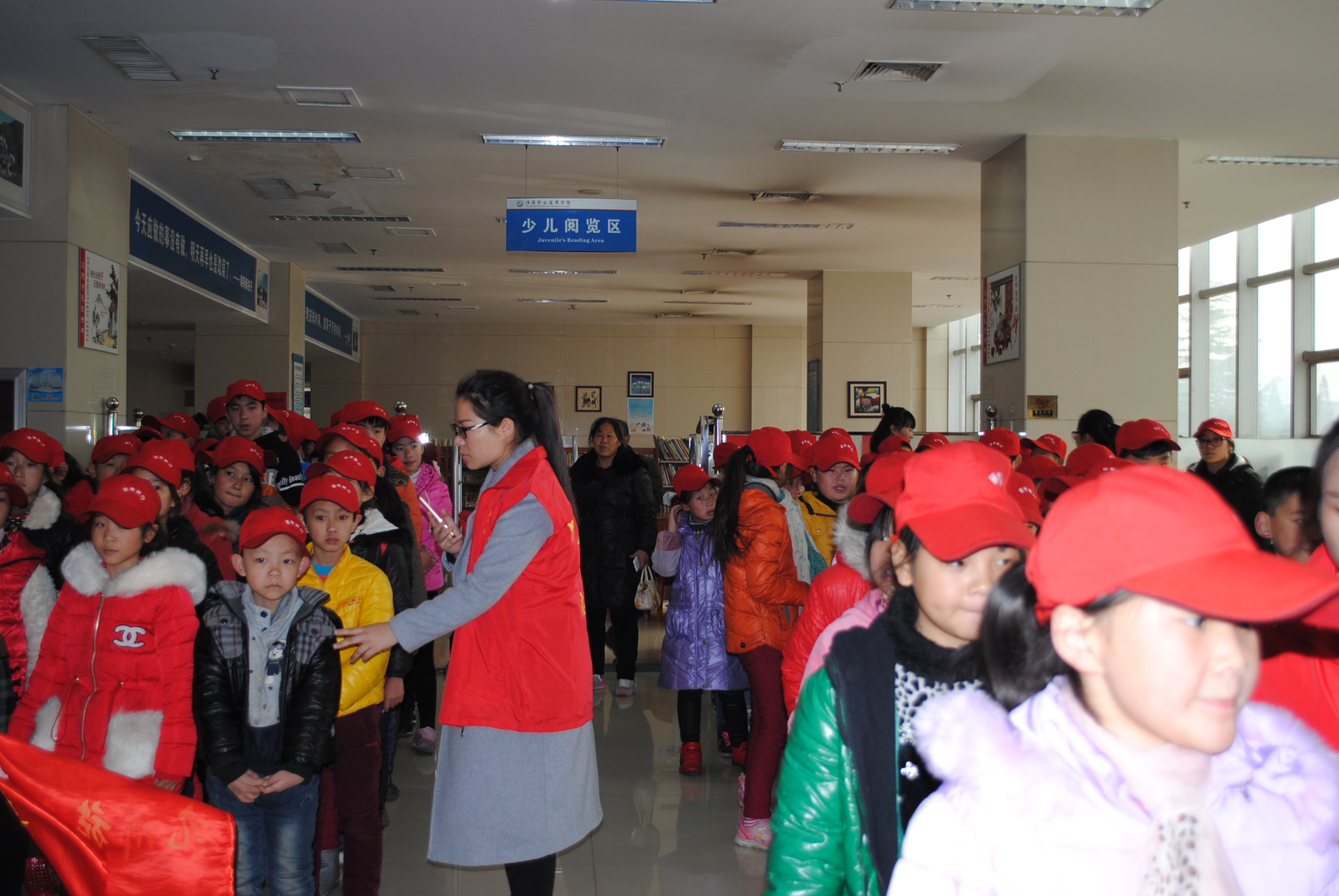 11 月 28 日 上午,济源市大峪镇第二小学150余名学生走进图书馆,在工作人员的带领下参观了少儿阅览室、综合书库、电子阅览室、王怀让文学艺术馆。图书馆是大峪二小研学活动第三站。