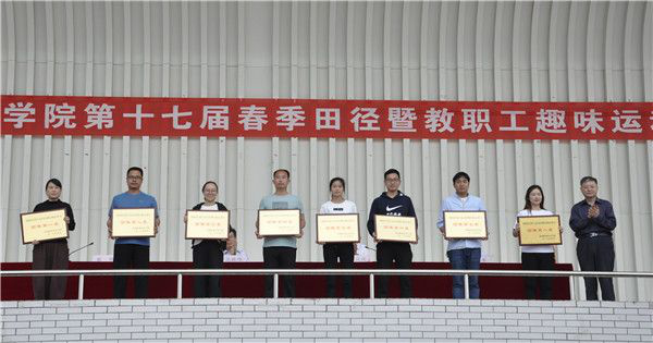 4月20日下午,我院第十七届春季田径暨教职工趣味运动会在高新校区操场圆满闭幕。1000余名师生参加了36个项目的竞技比赛,经过两天的激烈角逐,王大虎、商海杰2名运动员打破学院记录,王大虎等8位同学获得了优秀运动员称号,医学护理系等6个系部获得全体总分前六名,八工会获得教工代表队第一名。院党委书记范晓伟,院领导杜战儒、黎明、王向军分别为获奖团体和个人颁奖。