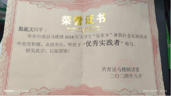 接团省委的表彰函,郭淑文同学于暑假期间积极参与河南省相关社会实践项目,在基层社会治理、乡村振兴、绿色发展等领域中勇于担当、甘于奉献,展现了新时代大学生良好的精神风貌。经基层团组织推荐,现认定为2024 年度河南共青团大学生“向基层报到” 项目济源职业技术学院优秀参与学生。