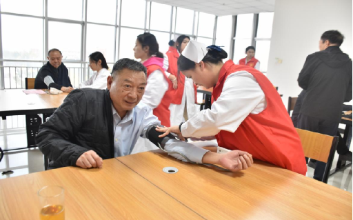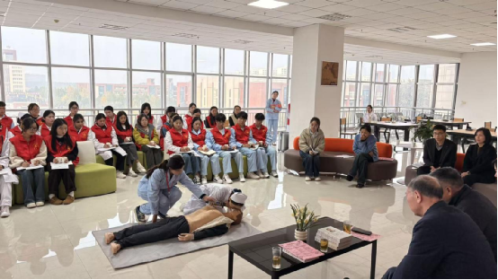 健康关怀成为本次活动的重要亮点。医学护理学院教师成芸开展老年人养生讲座,现场发放健康小贴士、品鉴菊花枸杞茶,将专业知识与人文关怀深度融合。值得一提的是,医学护理学院多名入党积极分子积极参与“健康加油站”服务,熟练演示心肺复苏、海姆立克急救法等技能,认真为老同志测量血压血糖,开展保健操教学,展现了医学生的专业素养和服务意识。