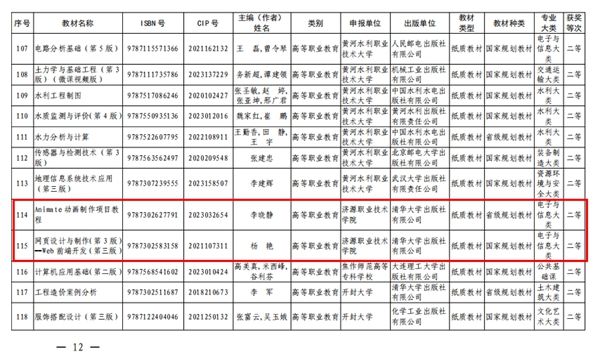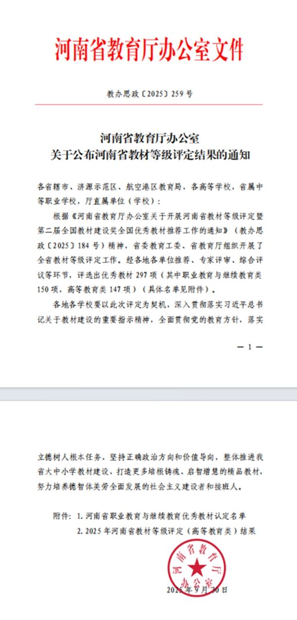 近日,在2025年河南省教材等级评定结果中,我校艺术设计学院李晓静主编的《Animate动画制作项目教程》和信息技术管理中心杨艳主编的《网页设计与制作(第3版)--Web前端开发》入选其中。此次教材等级评定经单位推荐、专家评审、综合评议,共评选出职业教育与继续教育类优秀教材150项,我校两部教材入选河南省职业教育与继续教育优秀教材,均荣获省级二等奖。