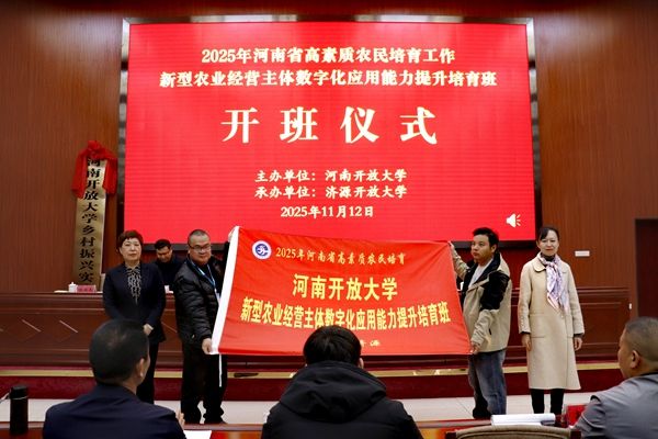 11月12日,由河南开放大学主办、济源开放大学承办的河南省高素质农民培育“数字赋能 振兴新农”新型农业经营主体数字化技能应用能力提升专题培育班在济源愚公移山精神教育基地正式开班。河南开放大学党委委员、副校长梁尔涛,河南开放大学乡村振兴学院院长王倩,济源职业技术学院校长王磊,济源示范区党工委组织部部务委员刘银珂,济源职业技术学院党委委员、宣传部部长姜小军,中共济源市委党校党委委员、校务委员聂红阳,济源职业技术学院继续教育学院院长、济源开放大学校长张鹏杰等相关领导出席开班仪式。姜小军主持仪式。