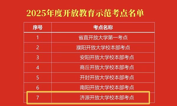 近日,河南开放大学公布2025年开放大学系统“示范考点”评选结果,济源开放大学荣获“示范考点”称号。
