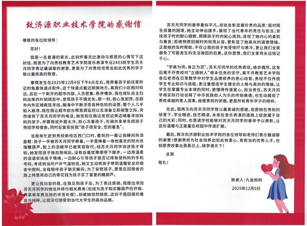 近日,我校教育艺术学院音乐表演专业2403班学生苏天月在街头偶遇一名走失幼童,临危不乱、主动施援,用温暖与责任守护了一个家庭的平安,其善行义举赢得社会广泛赞誉,并收到孩子家长亲笔书写的感谢信。