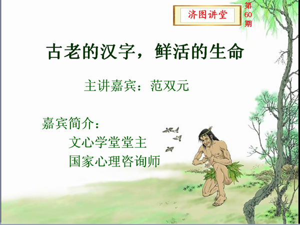 讲座中,范双元通过讲古圣先贤造字时的智慧故事阐释了汉字背后的文化。他讲解了汉字简化后字形的变化;并详细讲解了“七字根”----按照古人的认知规律、造字规律,把汉字分成人体、天文、地理、动物、植物、器物和符号七个类别,每个类别分别以“人、日、山、龙、木、工、一”为代表,也就是七字根。范双元认为七字根非常的奇妙,它能够把汉字每个字解出来,并且含有逻辑关系,七字根不仅可以用来识汉字,还是一种空间的架构、整体的智慧。