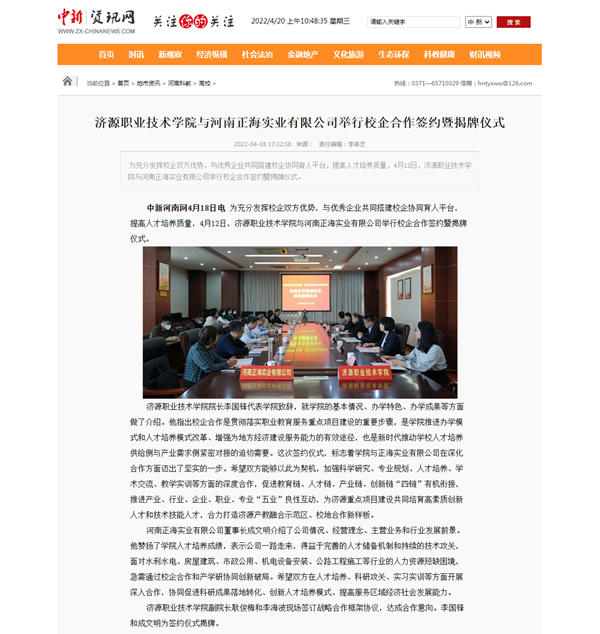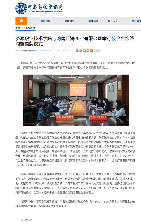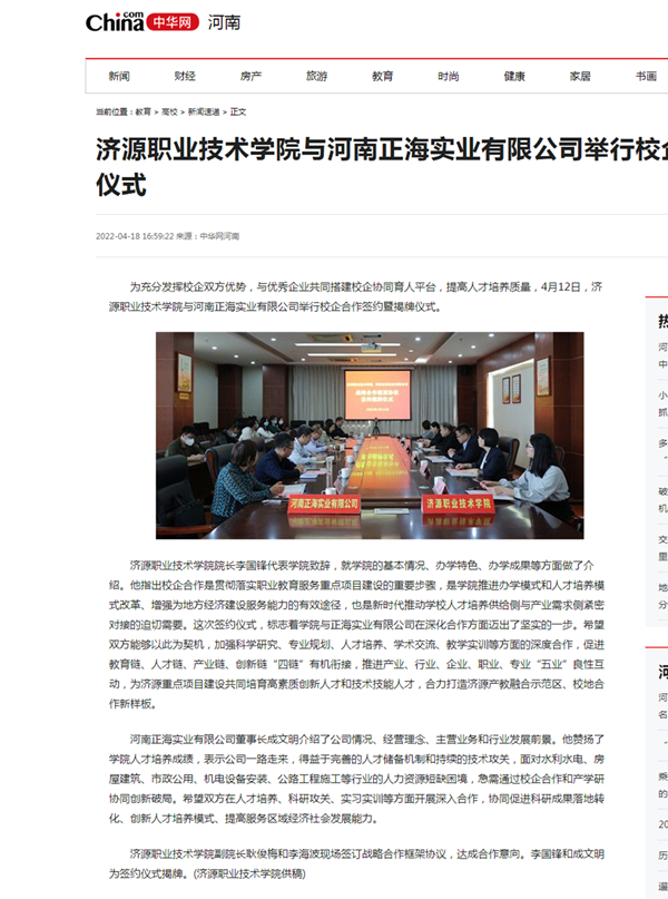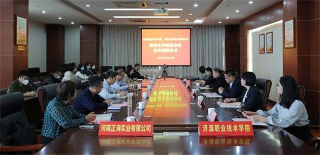 本网讯 为充分发挥校企双方优势,与优秀企业共同搭建校企协同育人平台,提高人才培养质量,4月12日,济源职业技术学院与河南正海实业有限公司举行校企合作签约暨揭牌仪式。