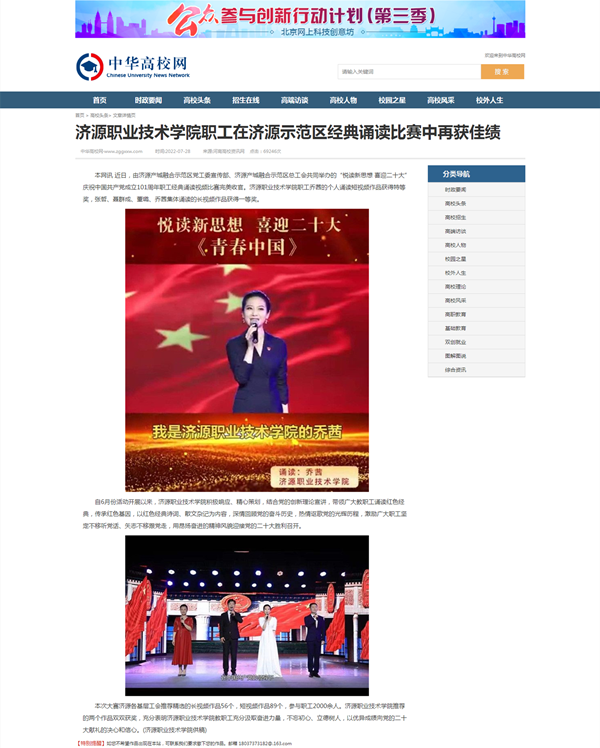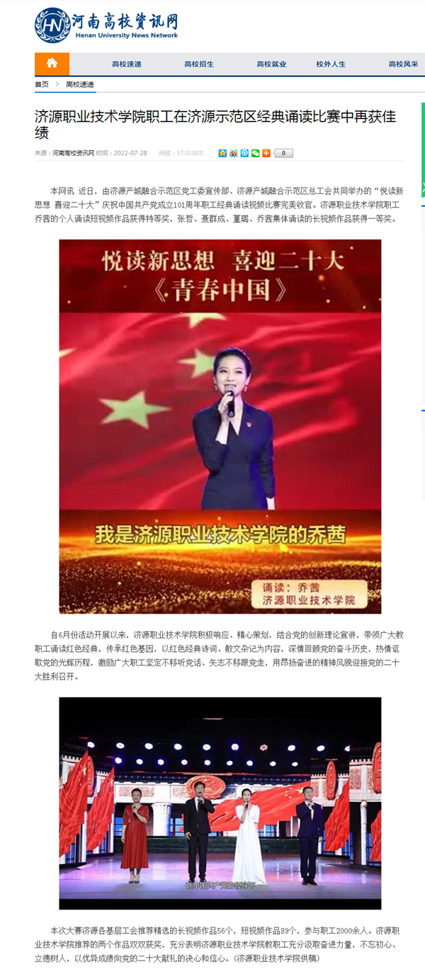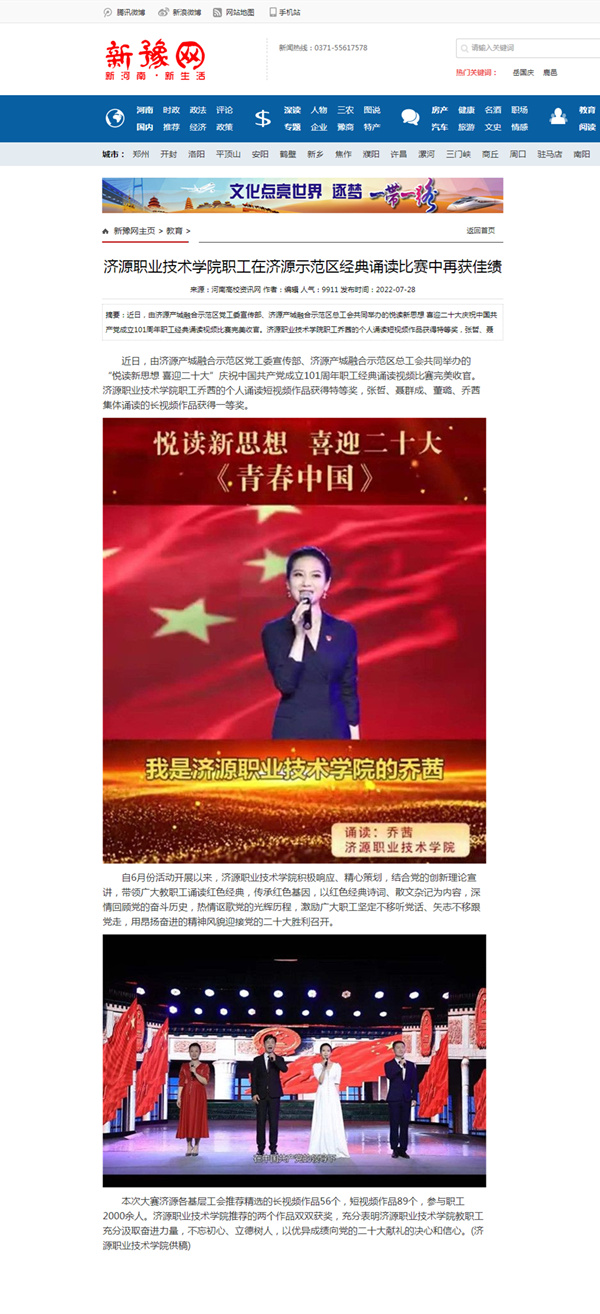 7月19日,由济源产城融合示范区党工委宣传部、济源产城融合示范区总工会共同举办的“悦读新思想 喜迎二十大”庆祝中国共产党成立101周年职工经典诵读视频比赛完美收官。我院职工乔茜的个人诵读短视频作品获得特等奖,张哲、聂群成、董璐、乔茜集体诵读的长视频作品获得一等奖。
