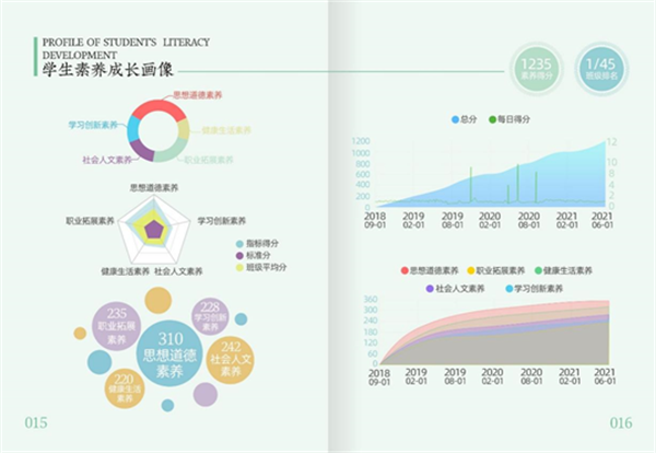 学校坚持以德为先、能力为重、全面发展,创新德智体美劳过程性评价,完善综合素养评价体系,出台了《学生综合素养考核评价细则》,运用云计算、大数据等信息化手段,设计开发了“新愚公”学生素养成长平台,对学生进行全方位全周期评价,内容上实现德智体美劳的全方位覆盖,时段上实现学生从入学到毕业的全周期记录,将“五大”核心素养细化为20个具体素养指标,设置215个实践项目和任务,线下开展项目实践,线上建立可视化“场景+”。