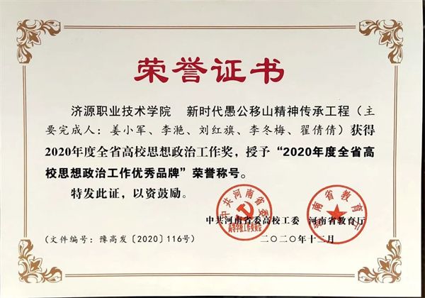 新时代愚公移山精神传承工程获得2020年度全省高校思想政治工作奖,被授予“2020年度全省高校思想政治工作优秀品牌”