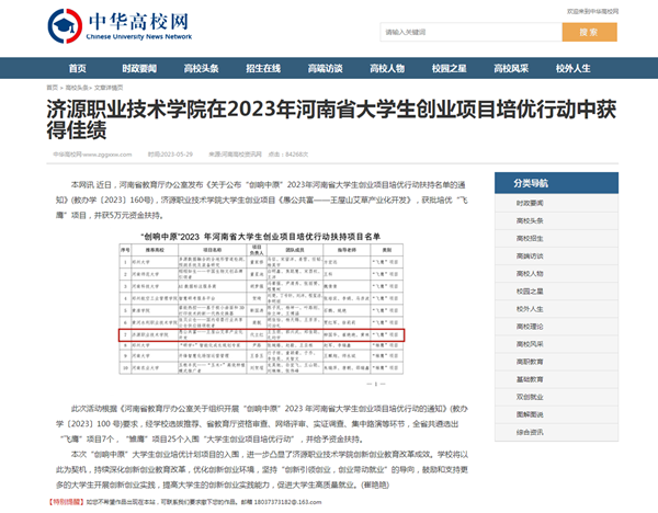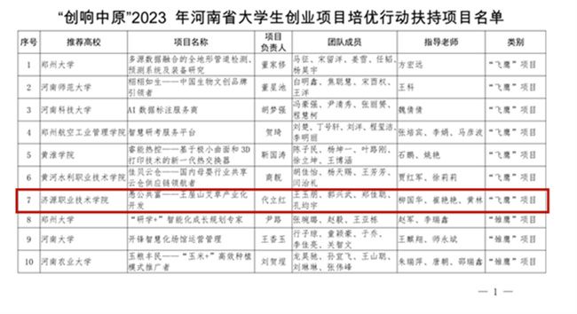 本网讯 近日,河南省教育厅办公室发布《关于公布“创响中原”2023年河南省大学生创业项目培优行动扶持名单的通知》(教办学〔2023〕160号),济源职业技术学院大学生创业项目《愚公共富——王屋山艾草产业化开发》,获批培优“飞鹰”项目,并获5万元资金扶持。
