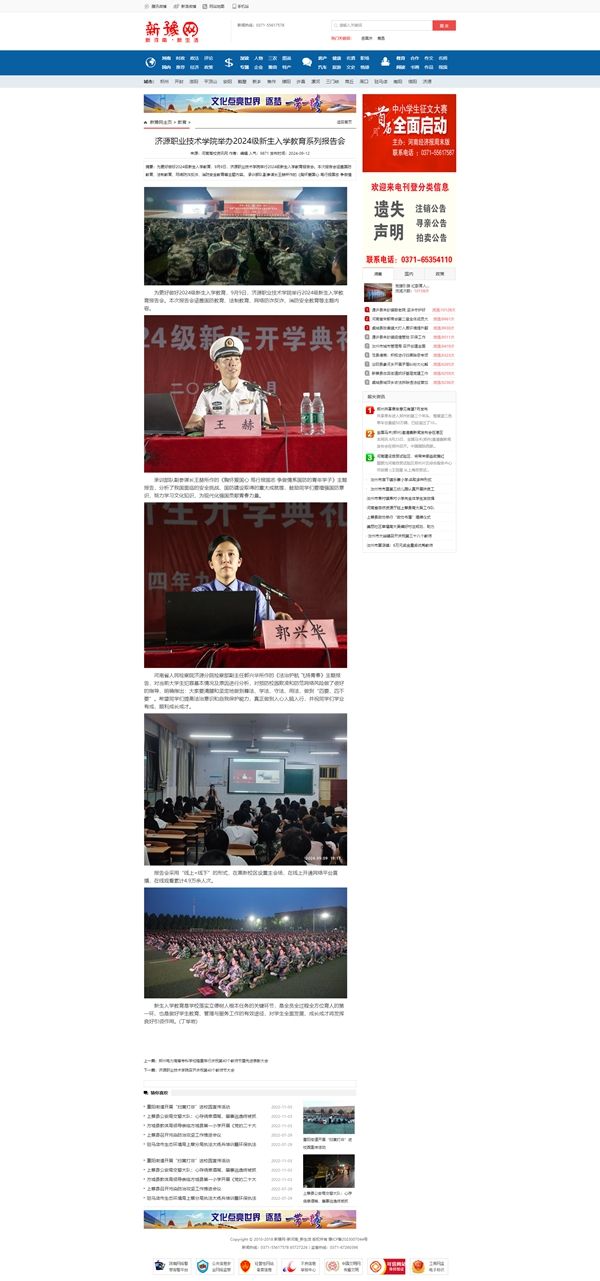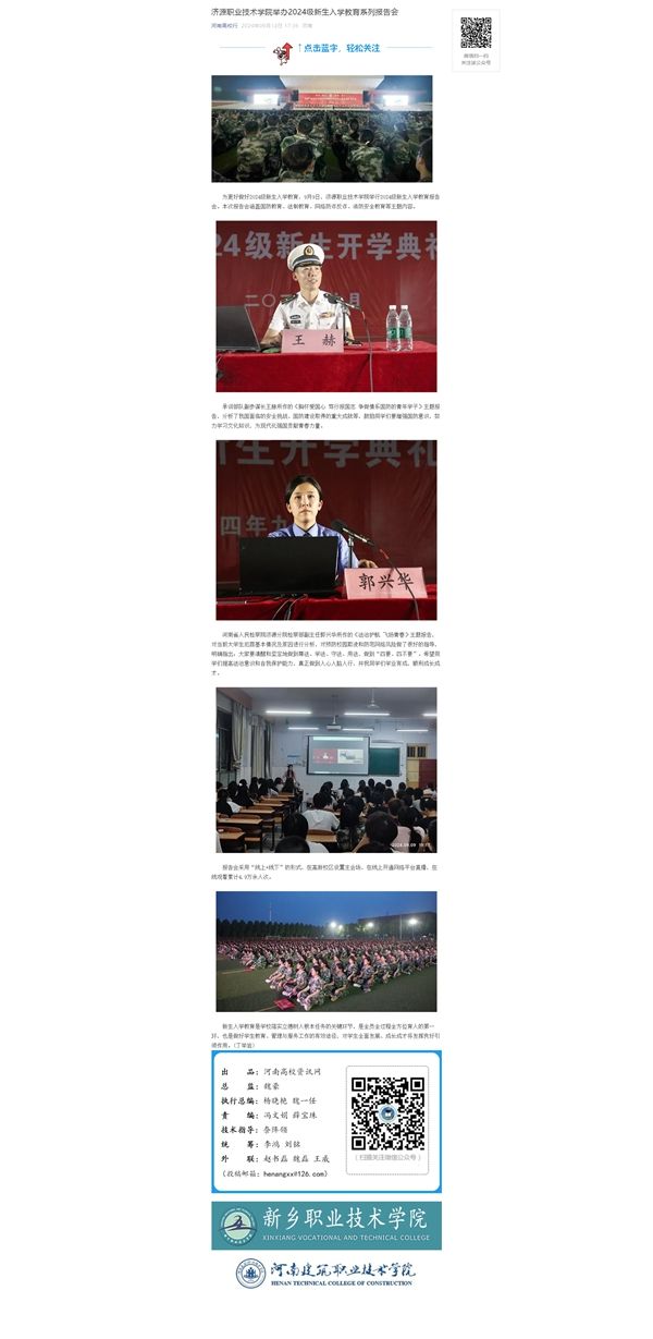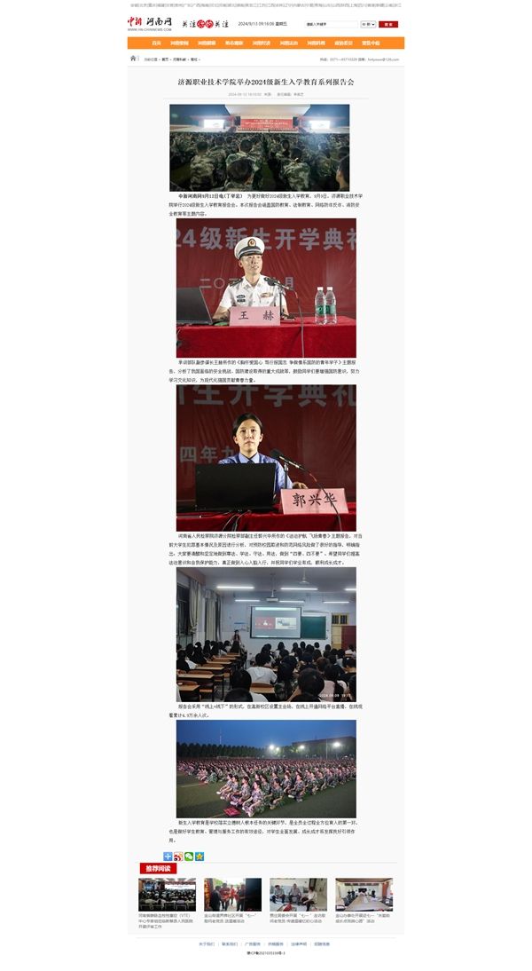转自9月12日中华高校网、河南高校行、 河南高校资讯网、中新网、河南经济网、新豫网:济源职业技术学院举办2024级新生入学教育系列报告会