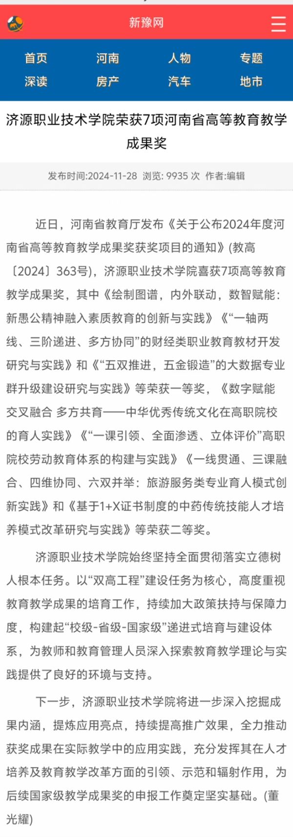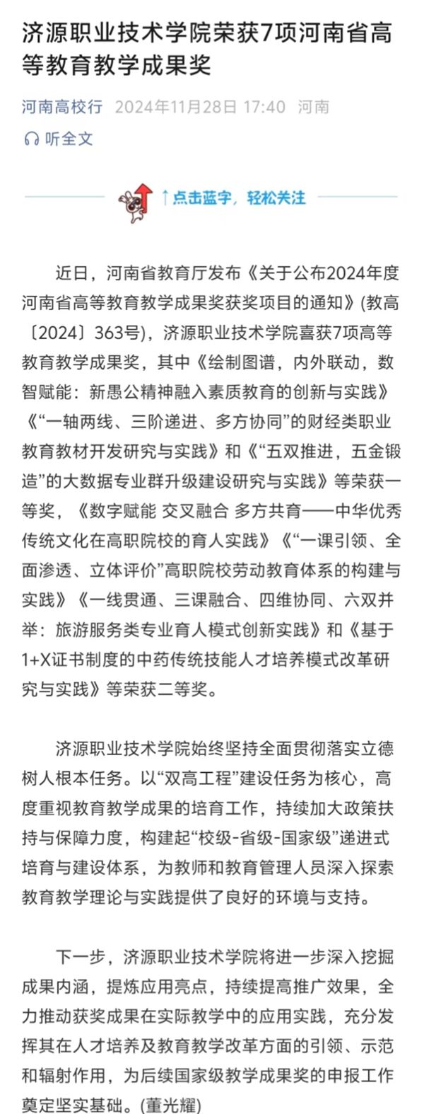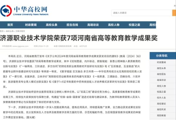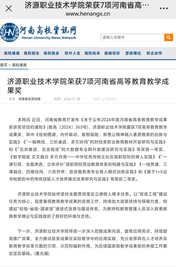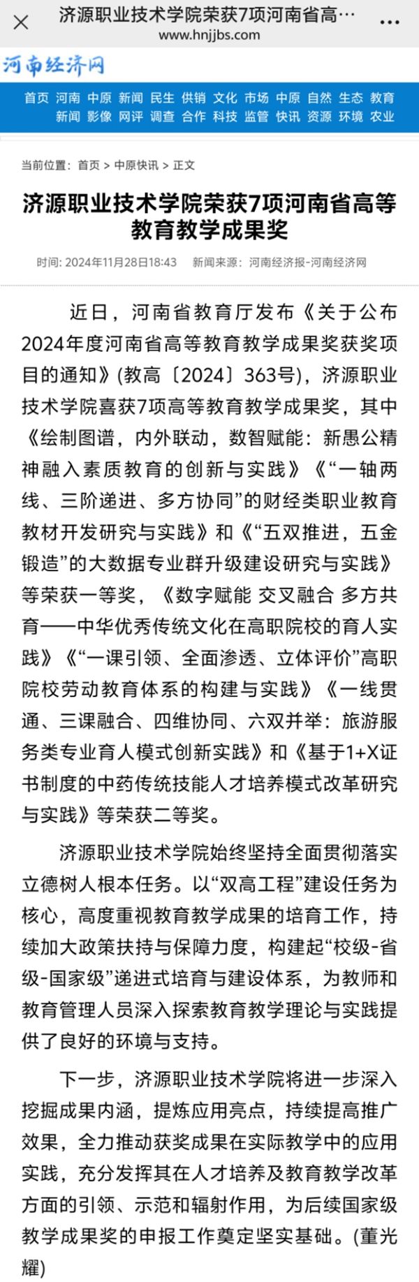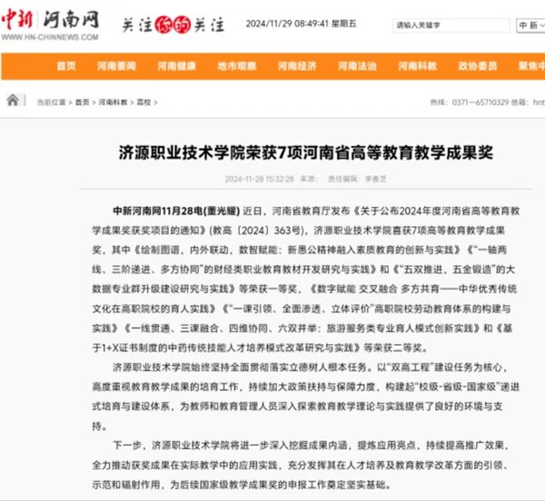 转自2024年11月28日河南经济网、河南高校资讯、中华高校网、中新网、新豫网、河南高校行:济源职业技术学院荣获7项河南省高等教育教学成果奖