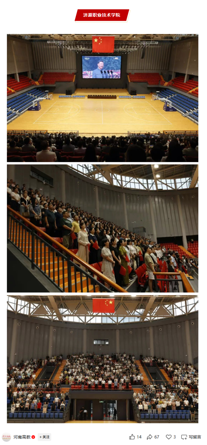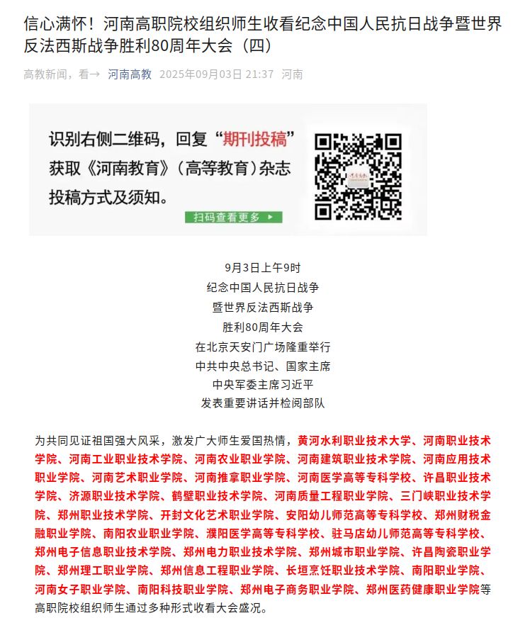 转自2025年9月3日 河南高教:信心满怀!河南高职院校组织师生收看纪念中国人民抗日战争暨世界反法西斯战争胜利80周年大会(四)