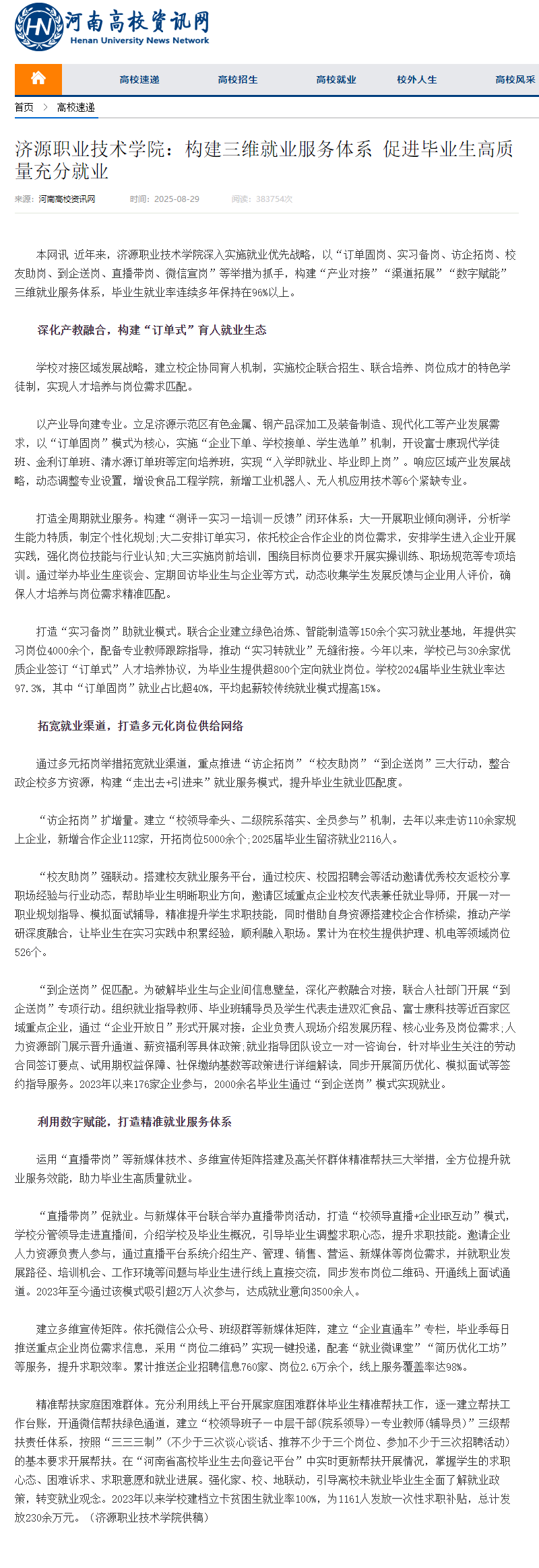 转自2025年9月29日 河南高校资讯网、河南高校行、中华高校网、中新网、新豫网:济源职业技术学院:构建三维就业服务体系 促进毕业生高质量充分就业