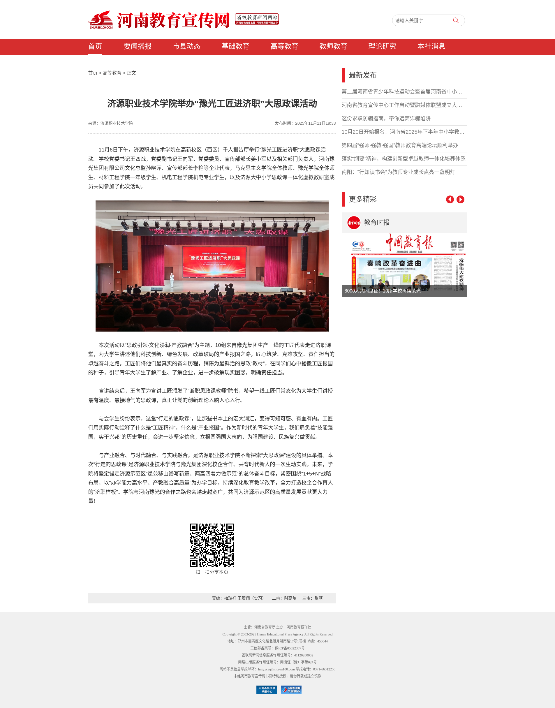 转自2025年11月11日 河南教育宣传网:济源职业技术学院举办“豫光工匠进济职”大思政课活动