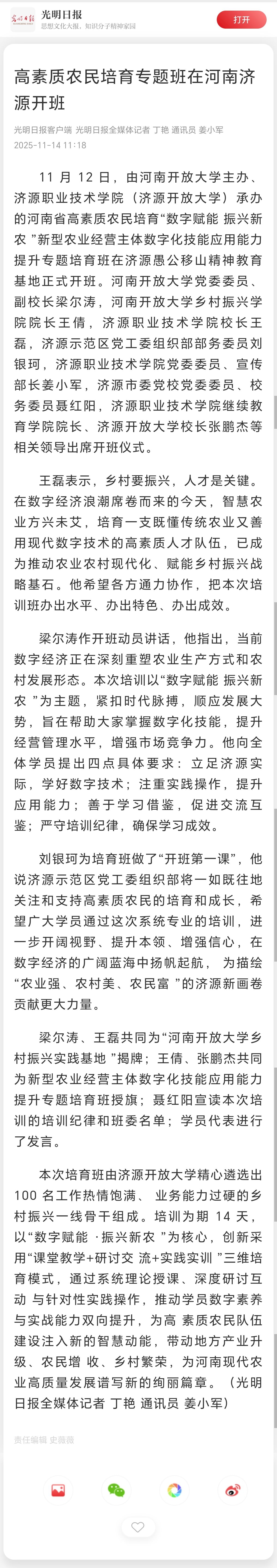 转自2025年11月14日 光明日报:全省高素质农民培育专题班在济源开班