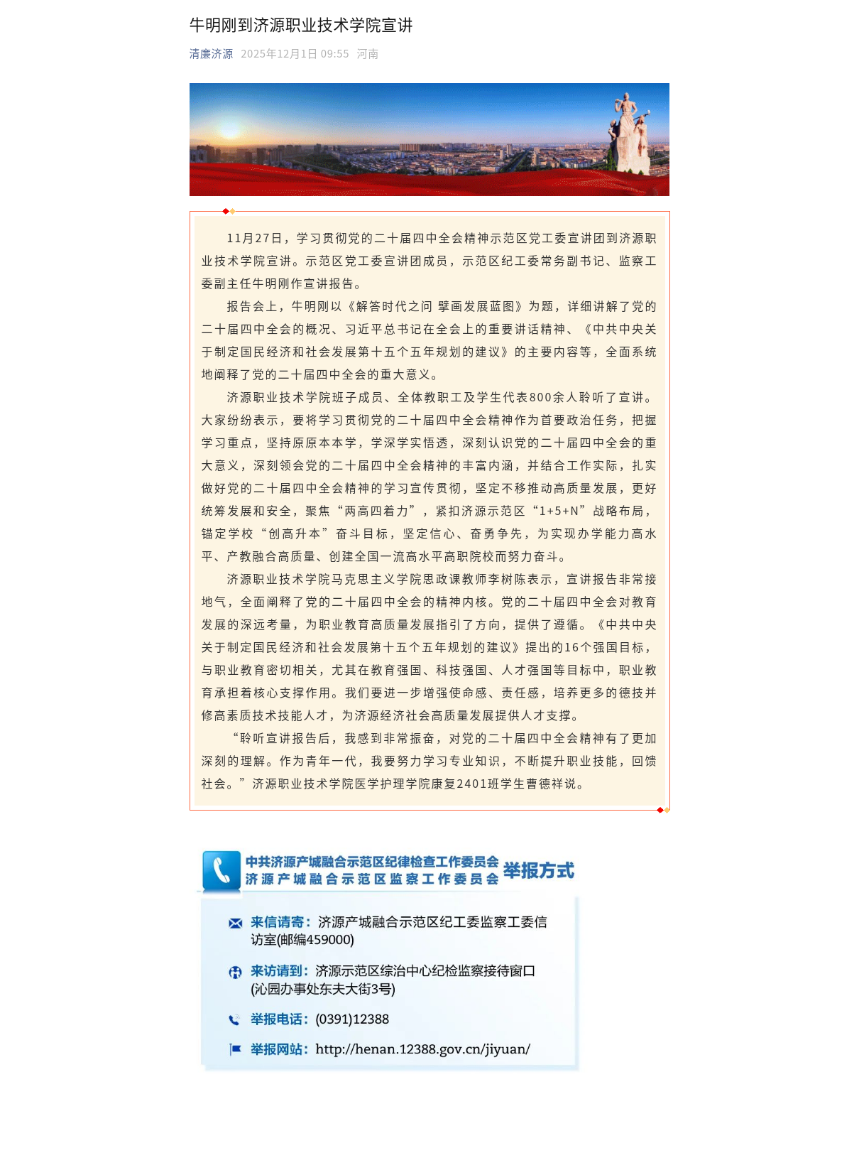转自2025年12月1日 清廉济源微信公众号:牛明刚到济源职业技术学院宣讲