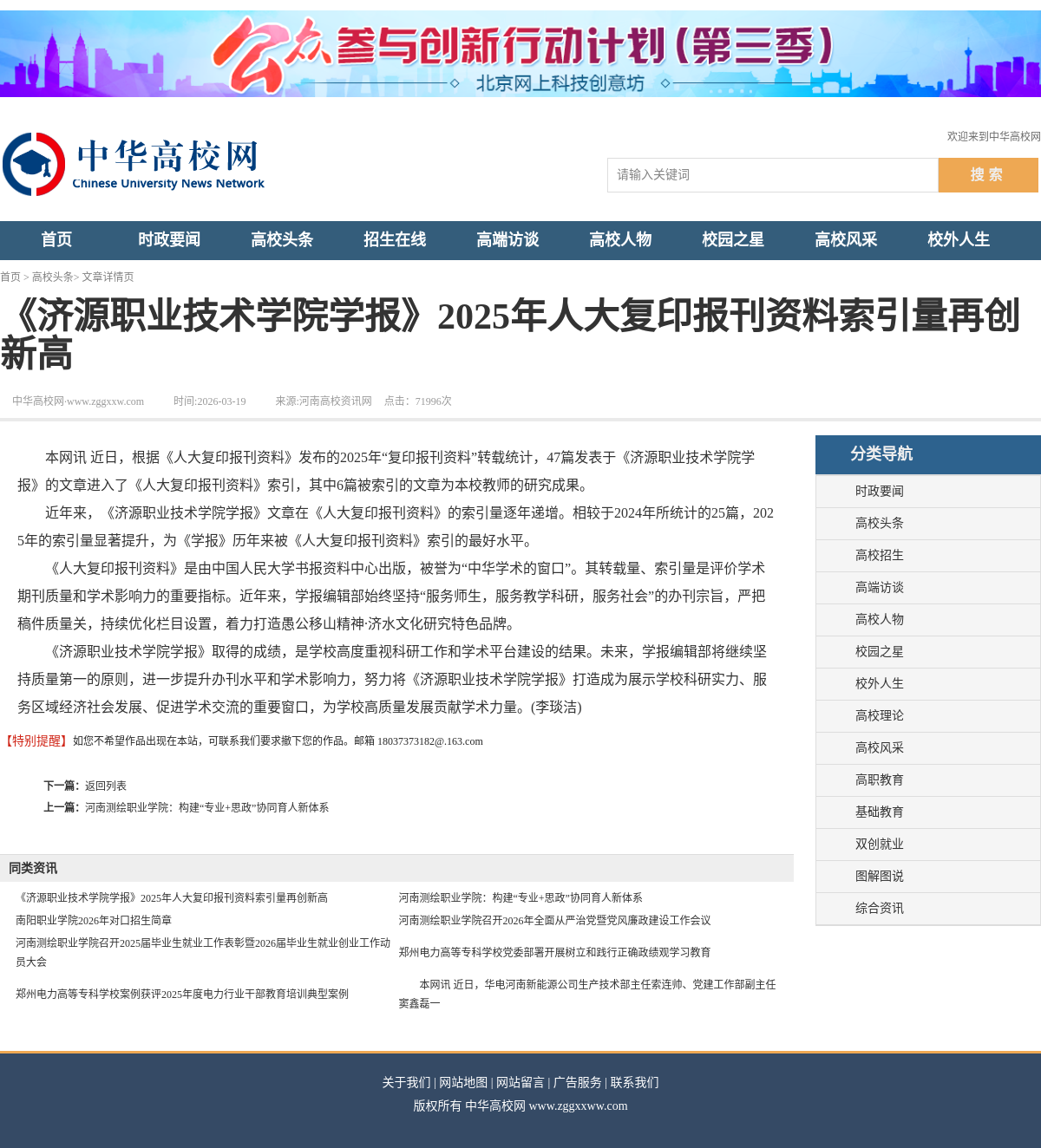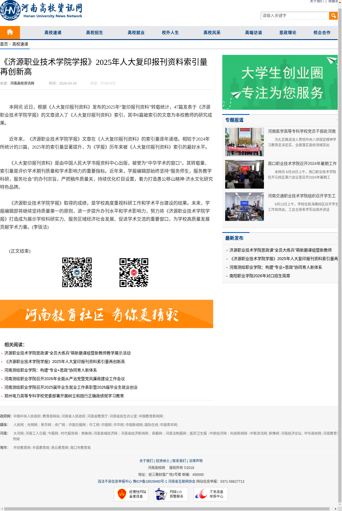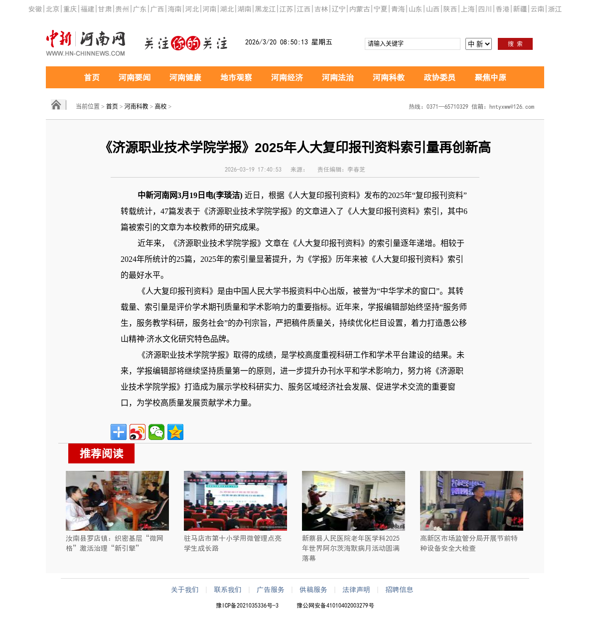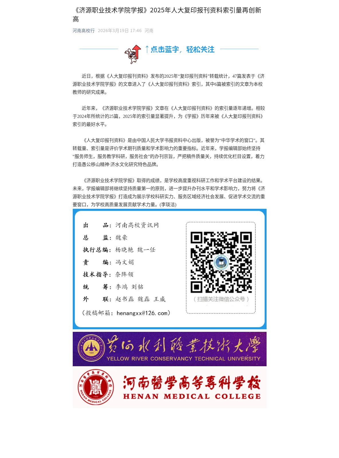 转自2026年3月19日 河南高校资讯网、中华高校网、中新网、河南高校行:《济源职业技术学院学报》2025年人大复印报刊资料索引量再创新高