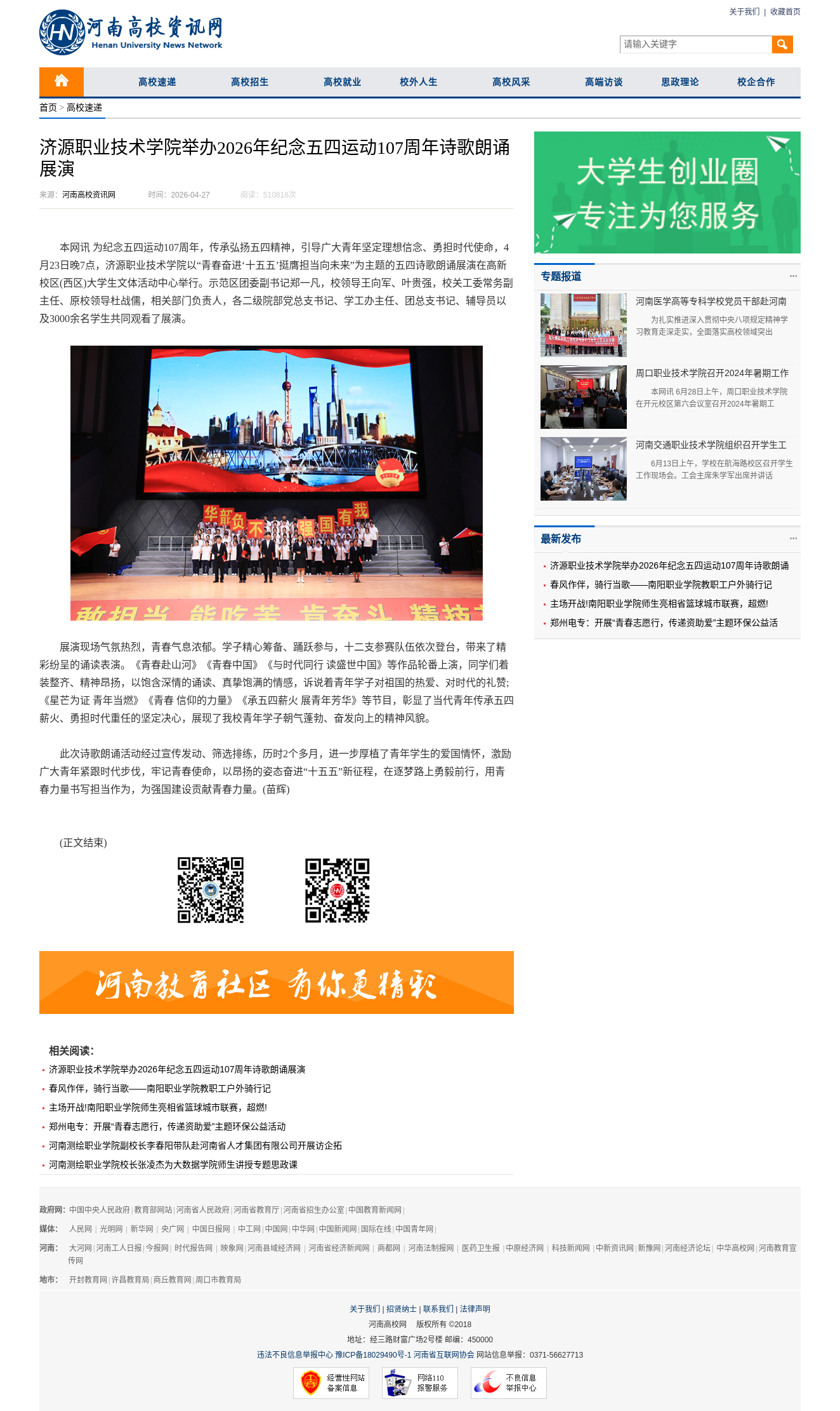 转自2026年4月27日 河南教育宣传网、顶端新闻、河南高校资讯网、中华高校网、中新网、河南高校行:济源职业技术学院举办2026年纪念五四运动107周年诗歌朗诵展演