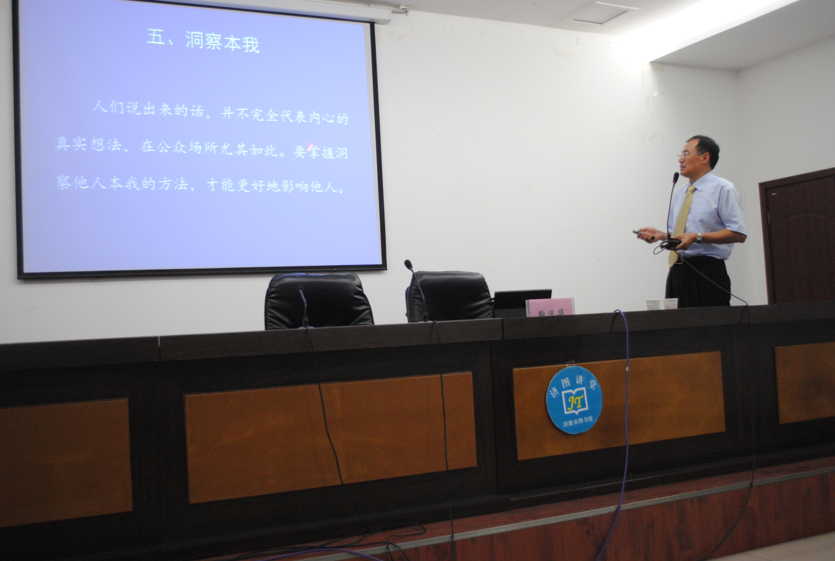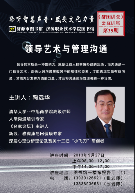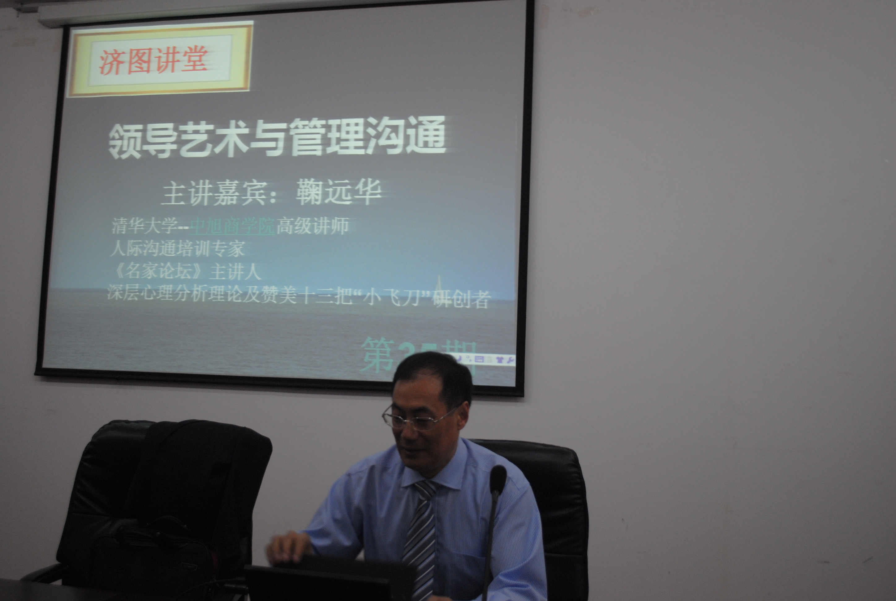 ,“济图讲堂”特邀清华集团讲师鞠远华在一楼报告厅做了《领导艺术与管理沟通》专题讲座,这是《济图讲堂》第35期讲座。济源市广播电视台总编辑陈慧滨、济源职业技术学院副院长郝小会、市文广新局副局长袁向生、牛健等领导,济源市市场办领导班子及全体职工、水利局、财政局部分职工,济源日报社、电视台、济源网等媒体记者以及企业界人士100余人聆听了讲座。