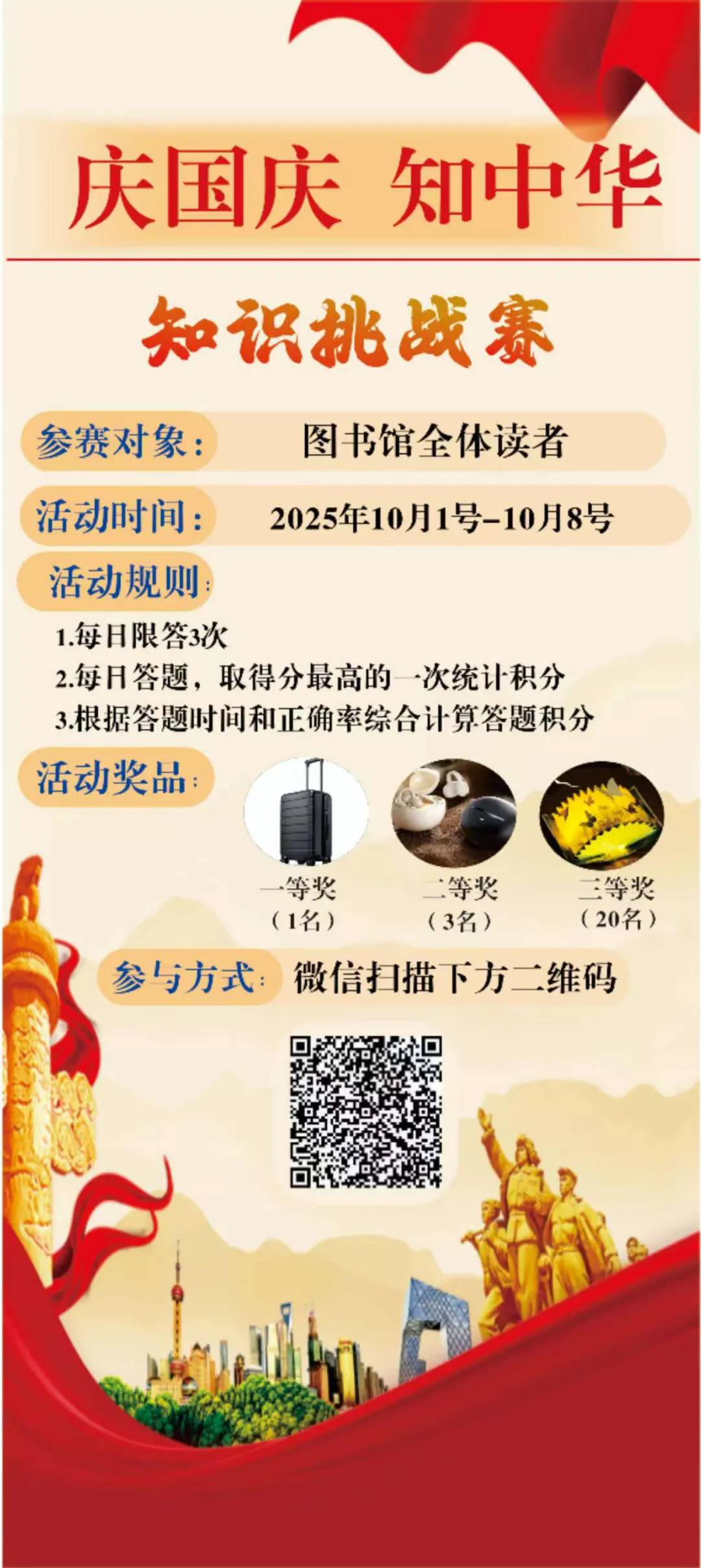 国庆的钟声敲响,一场关于中华知识的盛宴已为你备好!图书馆“庆国庆·知中华”知识挑战赛火热开启,邀你在知识的海洋里畅游,在国庆的氛围中感悟中华文化底蕴!
