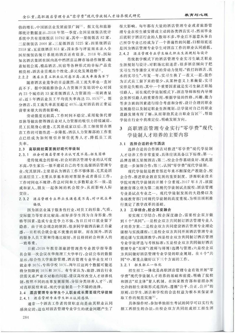 2019.6-绿色科技-高职酒店管理专业“零学费”现代学徒制人才培养模式研究--以济源职业技术学院为例(金仁重)