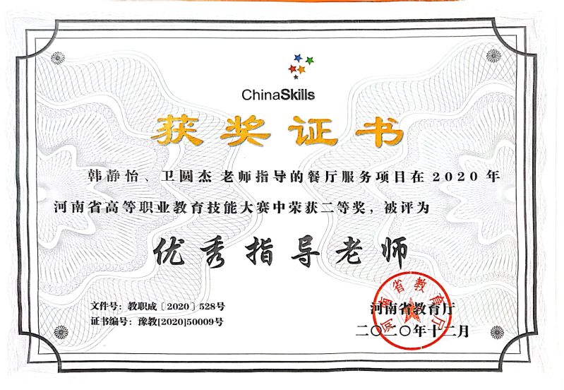 2020年韩静怡、卫圆杰获奖证书