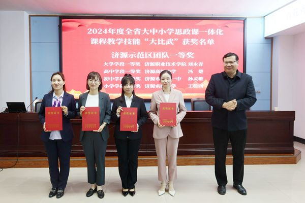 在2024年全省大中小思政课一体化大比武大练兵活动中获得团体一等奖的济源示范区教学团队作教学展示。济源实验小学王稼西、济水一中孙灵敏、高级中学冯楚、济源职业技术学院刘永青四位老师以《弘扬愚公移山精神 做奋发有为时代新人》为主题,进行了教学展示。