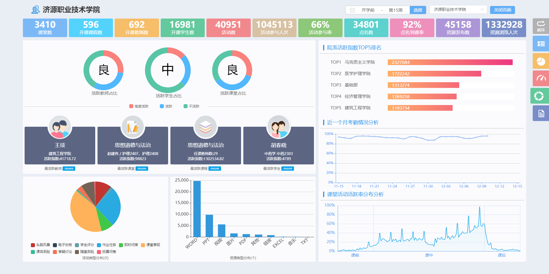 学校智慧课堂是基于大数据、云计算等新技术的课程教学平台。对教与学进行数据记录、分析和“云、网、”的运用,实现评价反馈即时化、交流互动立体化创设有利于协作交流和意义建构的学习环境。2016年正式上线,上线以来全院师生100%应用,每学期建设课堂3000余个,活动参与人次400000余次。积累了大量的教学数据,助推学校智慧化建设。