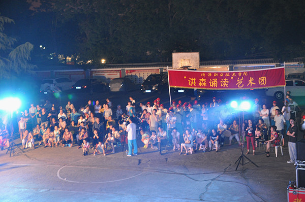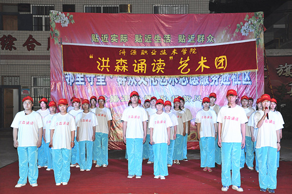 “洪森诵读”艺术团以广大群众喜闻乐见的诗歌、短剧、快板等形式,讴歌社会发展,传唱现代文明。通过丰富多彩的艺术形式宣传创建全国文明城市有关知识,为地方经济社会和谐发展尽责出力,体现了学院的历史担当,展示了学院的人文风采。