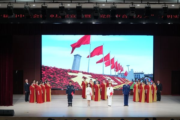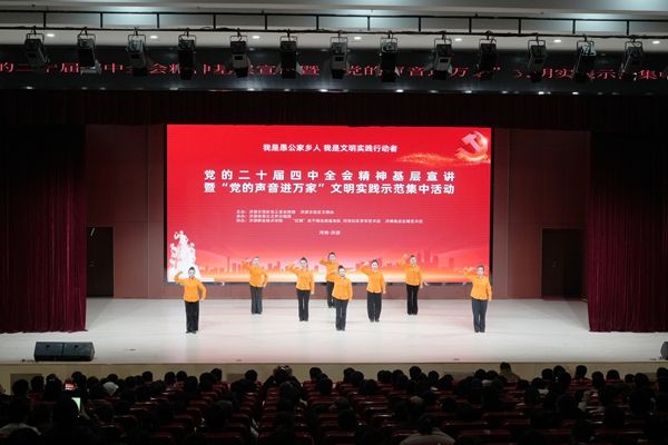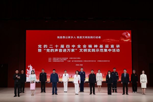 活动以“我是愚公家乡人 我是文明实践行动者”为主题,节目紧密围绕党的二十届四中全会精神,生动展现“十五五”发展蓝图。开场歌曲《迎风飘扬的旗》,节奏欢快,振奋人心,迅速点燃全场热情;小品《回家吃饭》以轻松幽默的方式,诠释了好的家风是家庭和谐幸福的基石,更是培育淳朴民风的基础;情景剧节目围绕党的二十届四中全会精神,把理论知识转化为通俗易懂的“家常话”,让大家在欢声笑语中加深理解、入脑入心;微课堂宣讲环节,我校马克思主义学院院长李滟老师带领全市15名各行各业的“新时代宣讲师”,潜移默化地把全会精神传递给在场观众,让大家更直观地体会到五年规划的价值与意义。新的时代,要有新的使命和新的作为,宣誓环节现场全体文明实践志愿者起立宣誓志愿者誓词,承诺践行奉献、友爱、互助、进步的志愿精神,传递真善美,传播正能量。活动在合唱《在党的旗帜下前进》中活动圆满结束。