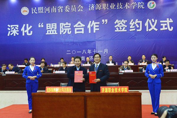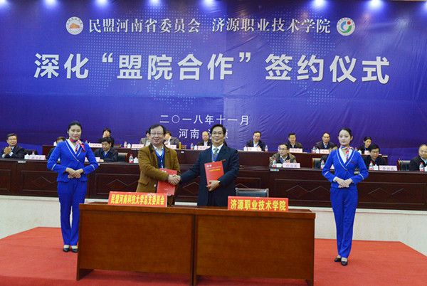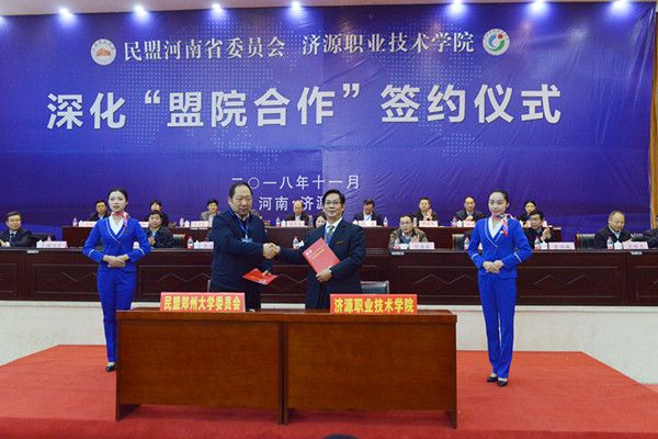 11月23日,深化盟院合作签约仪式在我院高新校区隆重举行。副省长、民盟河南省委主委霍金花出席会议并讲话,民盟中央社会服务部副部长段海溪,济源市委书记张战伟,民盟河南省委专职副主委柳锋波,省教育厅党组成员、省招办主任朱玉山,河南财经政法大学党委书记杨宏志,郑州航空工业管理学院党委书记付强,郑州轻工业学院校长赵卫东,郑州大学党委副书记李兴成,民盟河南省委副主委、河南科技大学副校长魏世忠,郑州师范学院党委副书记李树生,民盟河南省委副主委、郑州师范学院副院长刘济良,民盟河南省委秘书长姚中有,郑州大学党委委员、统战部部长王莉华,民盟河南省委高教委员会主任、民盟郑州大学主委臧卫东,民盟河南科技大学主委徐斌,民盟河南财经政法大学主委潘克勤,民盟郑州轻工业学院主委章银良,民盟郑州航空工业管理学院主委蒋志强,民盟郑州师范学院主委王新荣,民盟郑州市委主委郝伟,市委统战部副部长黄小利,民盟济源市支部主委苗礼战,学院党委书记范晓伟、院长陈学军等领导和学院300余名师生参加了签约仪式。副市长卫祥玉主持签约仪式。